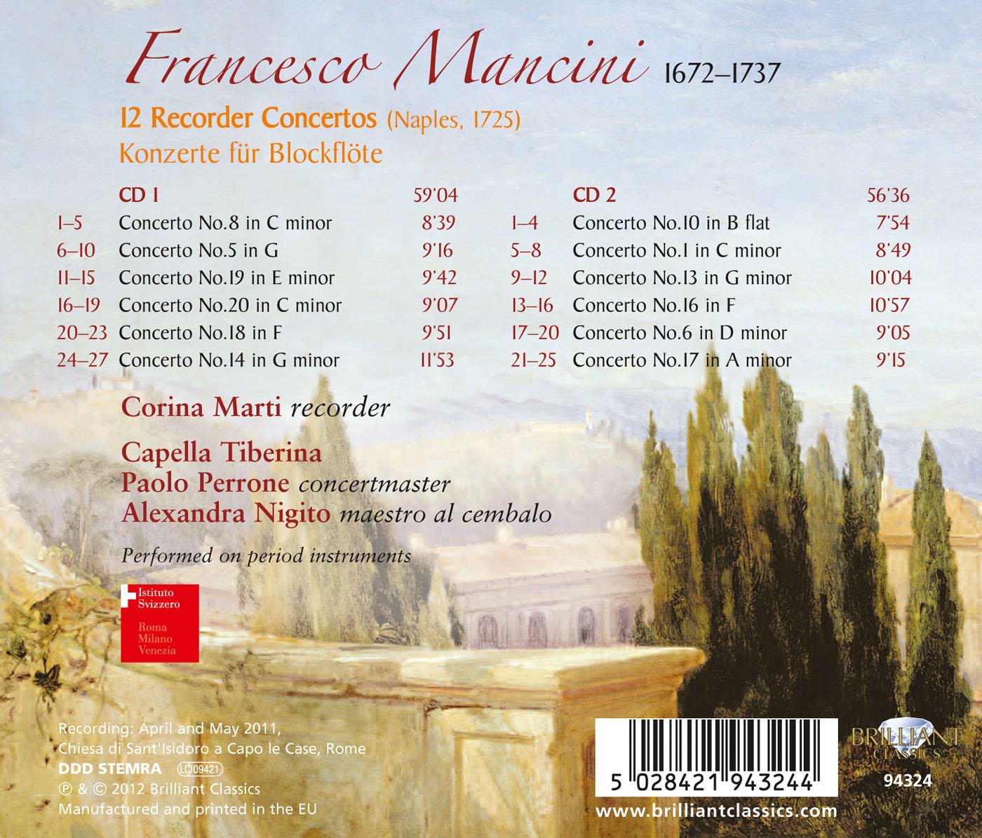 Back in 34:4 Raymond Tuttle reviewed a two-CD set issued by Brilliant Classics of 12 recorder sonatas by Mancini with the Ensemble Tripla Concordia. Now Brilliant has followed up with a set of 12 recorder concertos. Since virtually all the sonata numbers and key signatures are identical, I initially suspected that these were the same works under a different name, but that is not the case. Whereas the 12 sonatas are published works that first appeared in London in 1724 (with a misattribution to a “Sig.ra [sic] Francesco Mancini”!), the 12 concertos presented here are drawn from an unpublished manuscript of 24 concertos in a music conservatory in Naples, that also intermixes works by Alessandro Scarlatti, Domenico Sarro, Francesco Barbella, Giovanni Battista Mele, and Roberto Valentini (the English expatriate Robert Valentine)—hence their non-consecutive numbering. As Mancini was primarily an opera composer, his list of instrumental pieces is rather small, and these two collections would appear to comprise most of them.