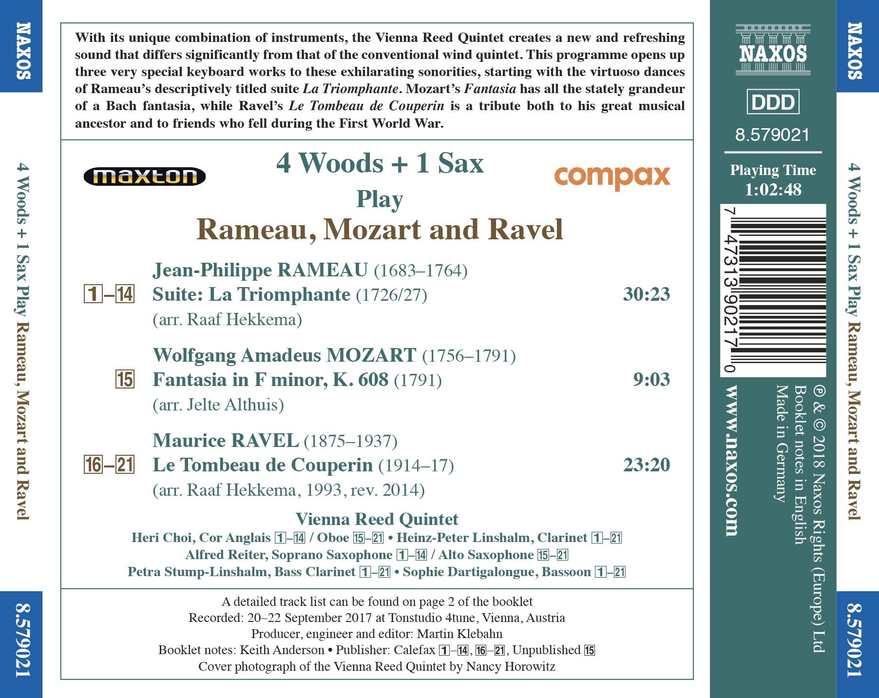 With its unique combination of instruments, the Vienna Reed Quintet creates a new and refreshing sound that differs significantly from that of the conventional wind quintet. This programme opens up three very special keyboard works to these exhilarating sonorities, starting with the virtuoso dances of Rameau’s descriptively titled suite La Triomphante. Mozart’s Fantasia has all the stately grandeur of a Bach fantasia, while Ravel’s Le Tombeau de Couperin is a tribute both to his great musical ancestor and to friends who fell during the First World War. The Vienna Reed Quintet is a first on the Austrian chamber music scene with its combination of single and double reed instruments in a chamber ensemble. With Heri Choi on oboe, Heinz-Peter Linshalm on clarinet, Alfred Reiter on saxophone, Petra Stump-Linshalm on bass clarinet and Sophie Dartigalongue on bassoon, five strong musical personalities present a fresh and unusual wind ensemble.