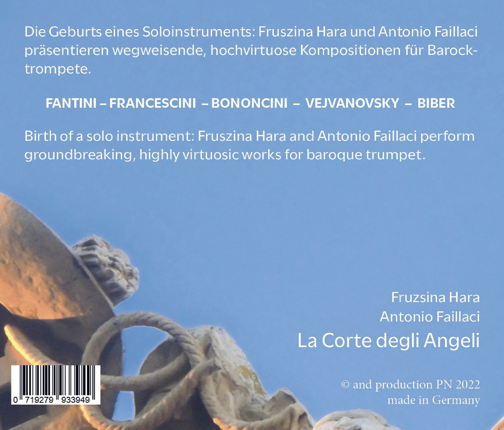The journey of this album started in Karlsruhe where Fruzsina Hara and Antonio Faillaci were studying in the class of Prof. Reinhold Friedrich and started playing the baroque trumpet with Dr. Edward H. Tarr. During these years they not only became good friends but also developed a mutual musical appreciation. Later Fruzsina became an internationally renowned professional baroque trumpet soloist who also performs with different ensembles and Antonio, also a modern and baroque trumpet soloist became professor at the Conservatorio della Svizzera Italia in Lugano, Switzerland. Bologna (then the Papal States, now Italy), as one of the chief musical centers of the Italian peninsula, has maintained a practically uninterrupted outstanding tradition of music. Kremsier, a town in central Moravia (now Kromeriz, Check Republic), was the residence of the bishops of Olomouc from the 13th century onwards. Bishop Karl II von Lichtenstein – Castelcorno rebuilt the city and the palace after the war which brought the most brilliant period of time in the history of Kremsier. The bishop not only rebuilt the residence and the town but also maintained a well-equipped court orchestra. Its leader was the trumpeter and composer Pavel Vejvanovsky. Join us on this journey from Bologna to Kromeriz!