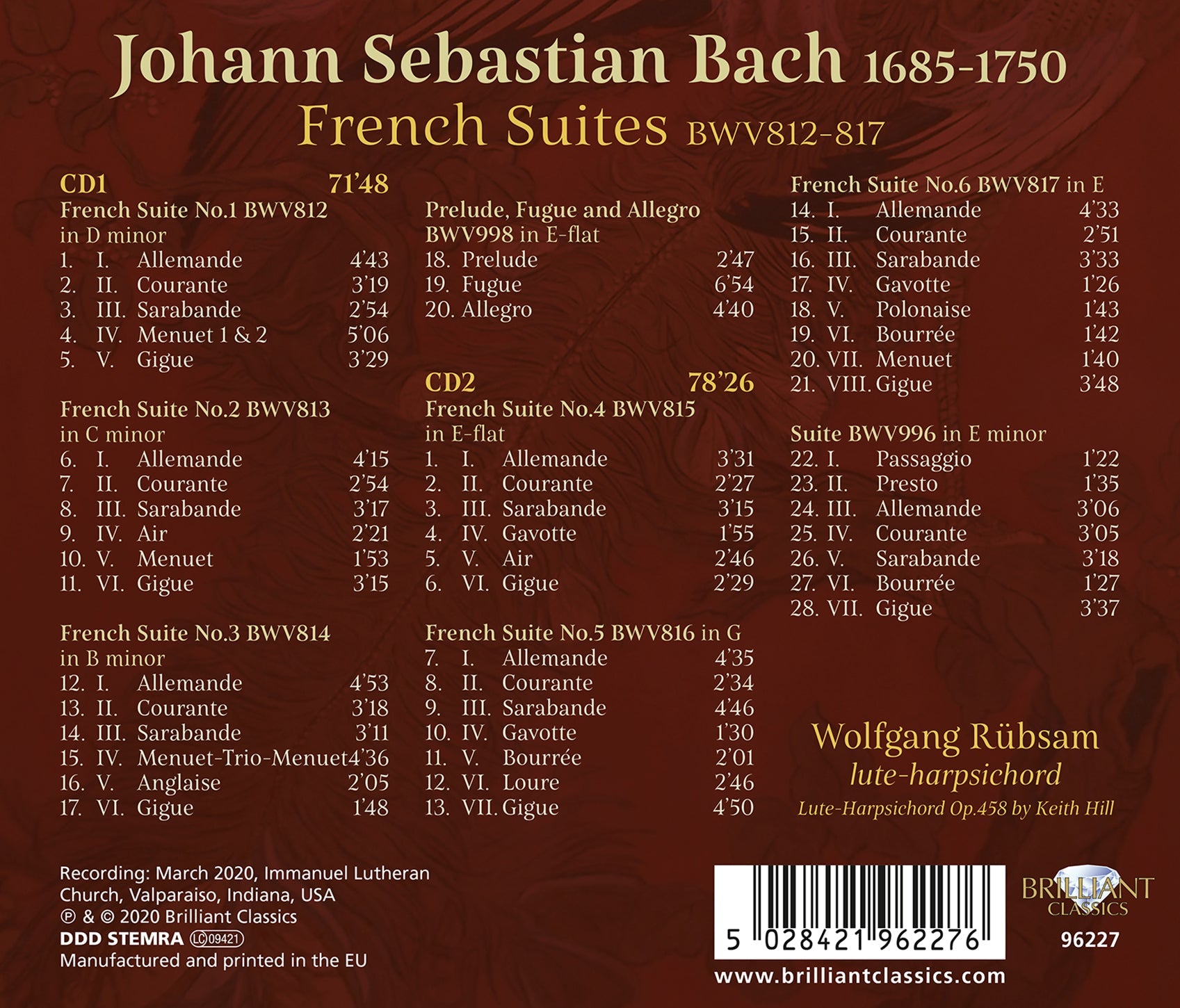 The title of French Suites does not originate from Bach’s hand: they were called “Suites pour le clavessin” by the composer. To judge from the number of copies made by his pupils, they likely played a significant role in domestic music-making in Bach’s home and in his teaching, and they remain among the most approachable of Bach’s keyboard works for performer and listener alike. As in the English Suites, Bach included the customary sequence of allemande, courante, sarabande and gigue, with additional short movements between the sarabande and gigue. Unlike the English Suites, however, they have no preludes and are generally of a more modest scale, both less stylized and less demanding in technical terms. Wolfgang Rubsam is internationally known as an authoritative Bach interpreter, from recordings of the organ and harpsichord on several different labels. He has recorded the French Suites before, on the piano. Made in March 2020, this new account is played on the kind of lute-harpsichord that Bach would have had at home for both music-making in the family and for teaching. The touch required and the sonority produced is delicate, subtly shaded and closely related in its effect to the music of Bach’s French contemporaries, whose music he knew well, such as Francois Couperin, Jean-Philippe Rameau and Louis Marchand. The cantabile style of playing heard in these marvelous performances is directly inspired by the instrument, a lute-harpsichord built for Mr. Rubsam in 2015 by the acclaimed American instrument-maker Keith Hill.