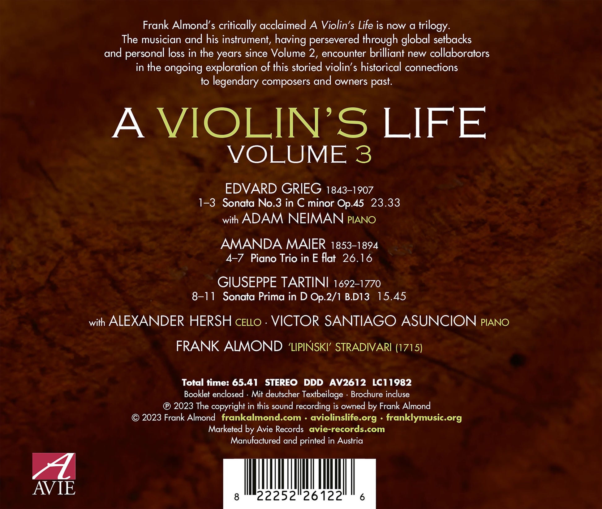 Frank Almond’s life is intertwined with that of his violin, the “Lipin´ski” Strad, an exceptional instrument named for the famed 19th-century Polish violinist Karol Lipin´ski and first owned by legendary 18th-century Italian composer-violinist Giuseppe Tartini, represented on A Violin’s Life, Volume 3 by his Sonata Prima in D, Op. 2, a trio sonata in all but name. The masterful Piano Trio in E flat by 19th-century Swedish virtuosa Amanda Meier connects with the instrument that had passed on to her future father-in-law Engelbert Ro¨ntgen. Another great Nordic composer, Edvard Grieg, opens the album with his great Sonata No. 3 in C minor. The legend of the Lipin´ski Strad went viral in 2014 when, following a concert, walking towards his car, Frank Almond was tasered by an assailant and the prized instrument was stolen. An FBI pursuit resulted in the recovery of the instrument within weeks. International media ensued on the BBC, NPR, and a feature in Vanity Fair. An award-winning documentary film “Plucked” premiered at the 2019 Tribeca Film Festival. Frank Almond’s critically acclaimed and chart-topping recordings of A Violin’s Life are now a trilogy. The “Lipin´ski” Strad lives on.