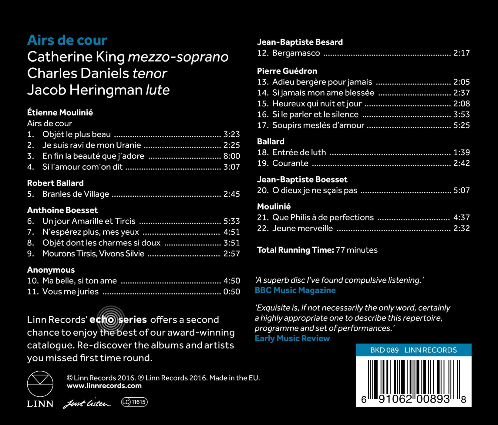 Named a ‘Choice’ recording by BBC Music Magazine upon release, this popular recording of seventeenth century vocal music features mezzo-soprano Catherine King and lutenist Jacob Heringman with tenor Charles Daniels. Originally released in 1999, ‘Airs de cour’ has been re-issued as part of Linn’s ECHO series which offers a second chance to enjoy the best of the label’s award-winning catalogue. The listener is transported to the French court in a programme of courtly airs and solo lute pieces, the latter a suitable complement to the airs and the lost ideals of the courtly society they reflect. Both the self-indulgent texts of these songs and their suave and rhythmically evasive melodies, reflect a society rich in excess, intrigue and dissembling, all the more fascinating for being so distant, no less impressive for being so introverted. Well schooled in period performance, all the performers pay due attention to the authenticity of pronunciation and ornamentation for which scant records remain. ‘O dieux je ne sçais pas’ is a rare example where an ornamented variant of the melody is included in the manuscript revealing a further level of riches in these songs. Catherine King is acknowledged as one of the most versatile mezzo-sopranos of her generation with an impressive breadth of repertoire. Jacob Heringman has established himself as one of the world’s most respected and most innovative solo lute players. Catherine King and Jacob Heringman have made numerous appearances together in festivals throughout Europe, as well as broadcasting frequently for the BBC and for WDR in Cologne. Charles Daniels is an English tenor, particularly noted for his performances of baroque music. He is a frequent soloist with The King’s Consort, and has made over 25 recordings with the ensemble.