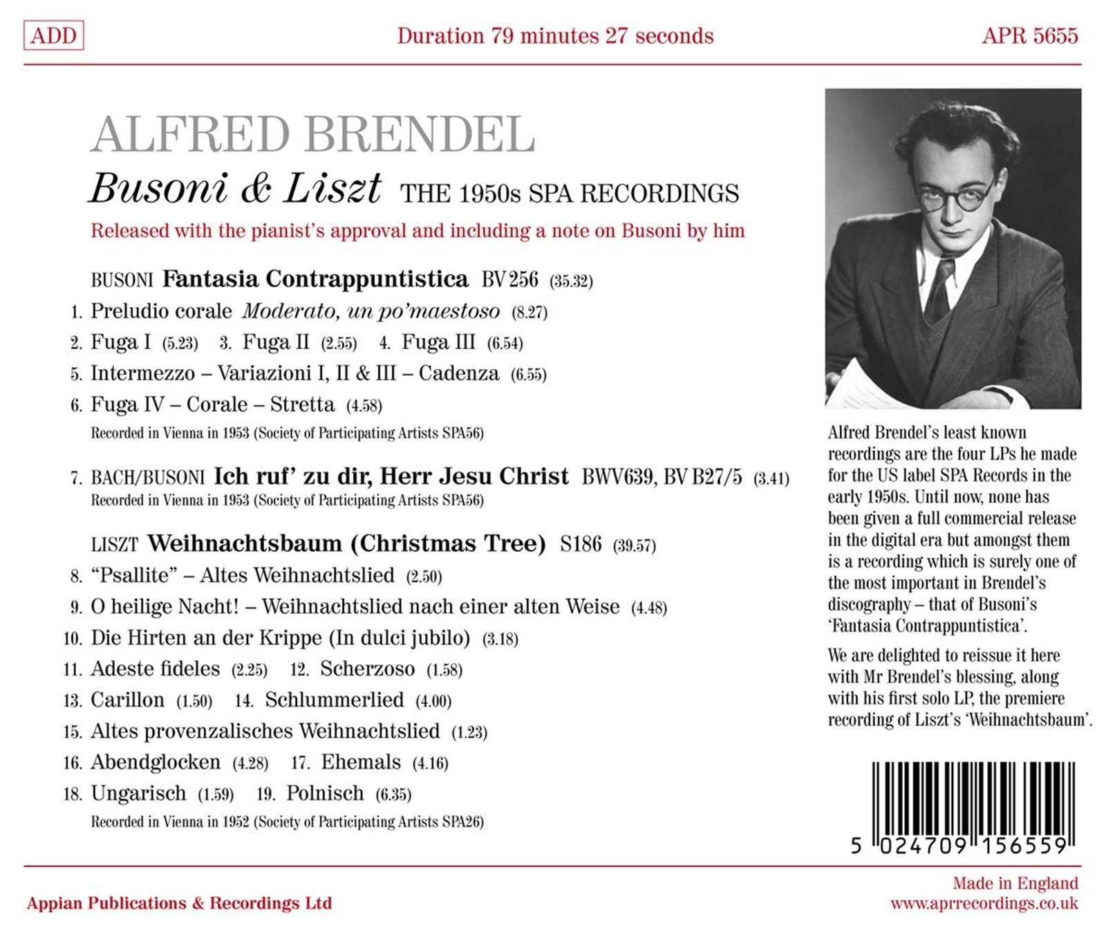 Alfred Brendel's least known recordings are the four LPs he made for the US label SPA Records in the early 1950s. Until now, none has been given a full commercial release in the digital era but among them is a recording which is surely one of the most important in Brendel's discography - that of Busoni's 'Fantasia Contrappuntistica', the composer's monumental response to Bach's 'Art of Fugue'. We are delighted to reissue it here with Mr Brendel's blessing, along with his first solo LP, the complete recording of Liszt's 'Weihnachtsbaum'. Both these works were recorded premieres at the time and the pianist was not to return to them again in the studio, so this marks an important addition to his available discography. The booklet contains a note by the pianist himself, written specially for this release, with his reflections on Busoni and the Fantasia Contrappunctistica.
