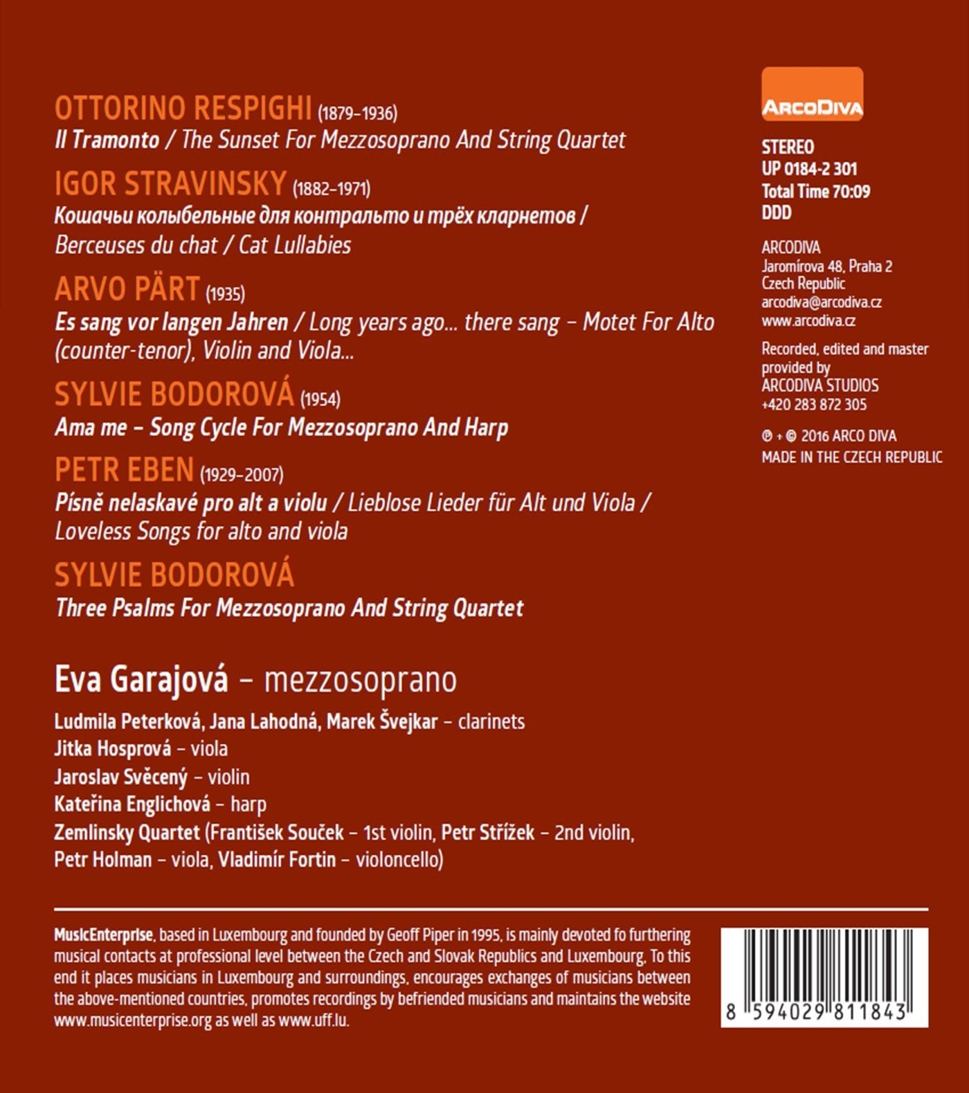 One of the leading mezzo-sopranos of the Czech Republic, Eva Garajova has an impressively wide-ranging repertoire to her name, not only excelling in operas, but also lieder and chamber works. This new release from Garajova focuses on the work of twentieth century composers, including Eben, Part, Stravinsky, and Respighi. Also included on this release are world premiere recordings of compositions by Czech composer Sylvie Bodorova.