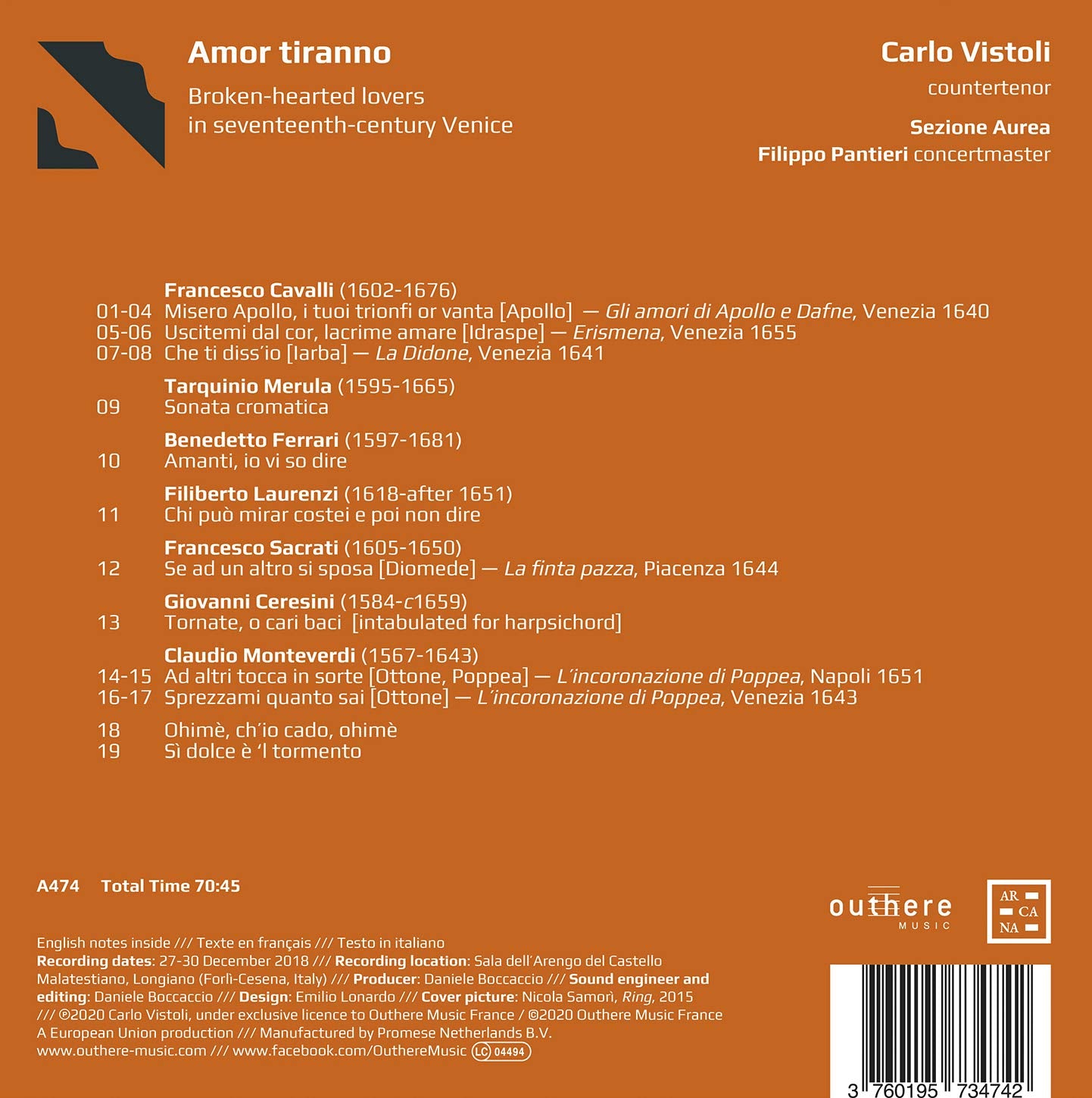 Following the success of ‘Arias for Nicolino’, a musical portrait of the celebrated castrato of Handel’s era (A427), Carlo Vistoli turns his attention to Venetian opera of the seventeenth century. The Italian countertenor – ‘a voice [...] intrinsically beautiful, strong and powerful’ (Opera Magazine) – has been delving into this repertory since the beginning of his international career with specialists such as Leonardo Garcia Alarcon, William Christie and John Eliot Gardiner. In this anthology accompanied by the ensemble Sezione Aurea, the focus is on operatic scenes and chamber music by the leading composers of the time, such as Francesco Cavalli and Claudio Monteverdi, whose famous aria ‘Sì dolce e ’l tormento’ exemplifies the linking thread of the arias in this recording: disappointed lovers. They express their disillusion not only through lamenti, but also in a lighter, more humorous fashion that can include dance forms, as in the chaconne ‘Amanti, io vi so dire’ by Benedetto Ferrari, a lesser-known but historically important composer who, like Filiberto Laurenzi and Francesco Sacrati, contributed to the development of the dramma per musica as a genre.