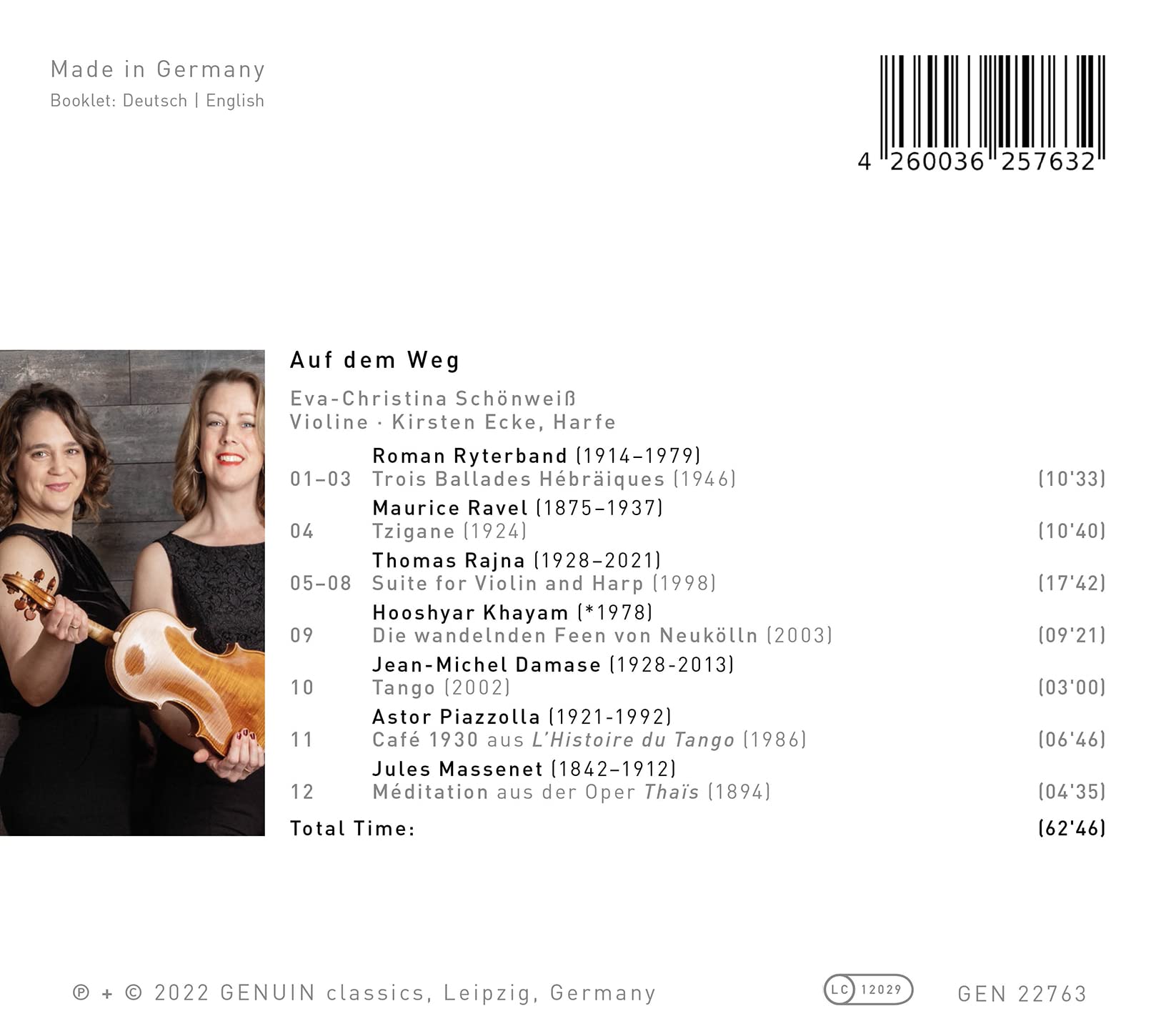 Two experienced chamber musicians, who have already worked as soloists with the Deutsches Sinfonie-Orchester, present a duo album on GENUIN of works ranging from the late Romantic period to the 21st century. In a release that crosses all boundaries, Eva-Christina Schönweiß (violin) and Kirsten Ecke (harp) have put together an exciting program featuring music of people in transit and in search of a home. In doing so, they wander through a wide variety of cultures, performing duos by the great masters of classical modernism such as Maurice Ravel and Astor Piazzolla, as well as contemporary music by Roman Ryterband, Thomas Rajna, Hooshyar Khayam and Jean Michel Damase. The two instruments complement each other perfectly; the floating sounds of the harp and the sonorous warmth of the violin make for distinctive and exciting tonal blends.