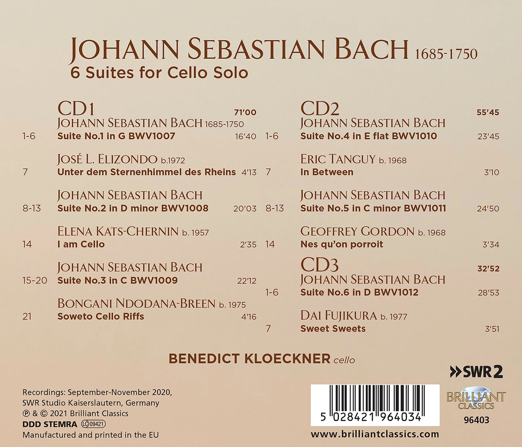 A highly regarded representative of the new generation of cellists, Benedict Kloeckner has been championed by such maestros as Daniel Barenboim and Sir Simon Rattle. With a discography including an acclaimed recording of the Schumann Cello Concerto nominated for the German Record Critics prize, Kloeckner also demonstrates a great interest in new music. He plays an Italian Cello by Francesco Rugeri (Cremona 1690), formerly played by Maurice Gendron. In this three-album set he tackles the sacred summit of the solo cello repertoire, rightly pointing out that the lack of original manuscripts for the Six Suites leaves them especially open to individual interpretation. Yet he takes a further step in making this recording his own, interpolating between each of the suites miniature compositions for solo cello that he commissioned from composers on six different continents under the motto “Sounds of Light”, thereby placing Bach’s Western European masterworks in dialogue with music from across the globe in our own time.