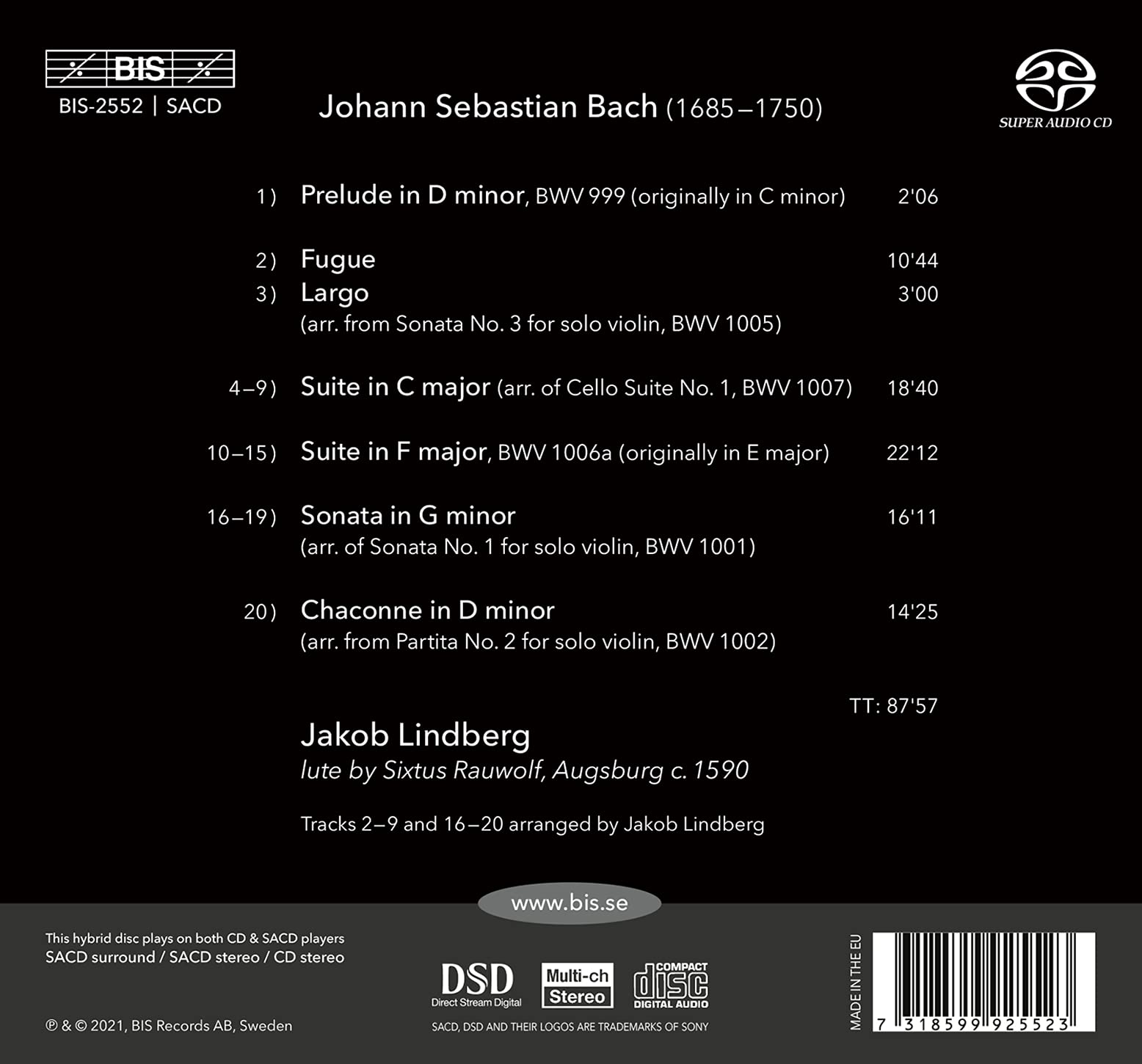 Bach was renowned as a keyboard player as well as being an accomplished violinist, but as far as we know he didn't play the lute. He seems to have been fascinated by the instrument’s special sound qualities, however, and was clearly inspired by the possibilities of the Lautenwerk. This was a gut-strung harpsichord designed to imitate the sound of the lute and at least some of the works usually referred to as ‘the Bach Lute Suites’ were probably composed for this instrument. Jakob Lindberg recorded the complete suites in 1992. Returning to the composer almost three decades later, he does so in the company of his Rauwolf lute, an instrument built in Augsburg around 1590 and ‘modernized’ in 1715, during Bach’s lifetime. But this time, only two of the works belong to the standard lute repertoire – the Prelude BWV 999 and the Suite BWV 1006a, which in fact is the composer’s own arrangement of his Partita No. 3 for solo violin. For the remaining works on the disc Lindberg has taken the cue from Bach, making arrangements of Cello Suite No.1 and Sonata No. 1 for solo violin in full. He has also chosen individual movements from other solo works, including the highly complex fugue from Sonata No. 3 for solo violin. The amply filled album (88 minutes!) closes with the iconic Chaconne from Partita No. 2 in D minor.