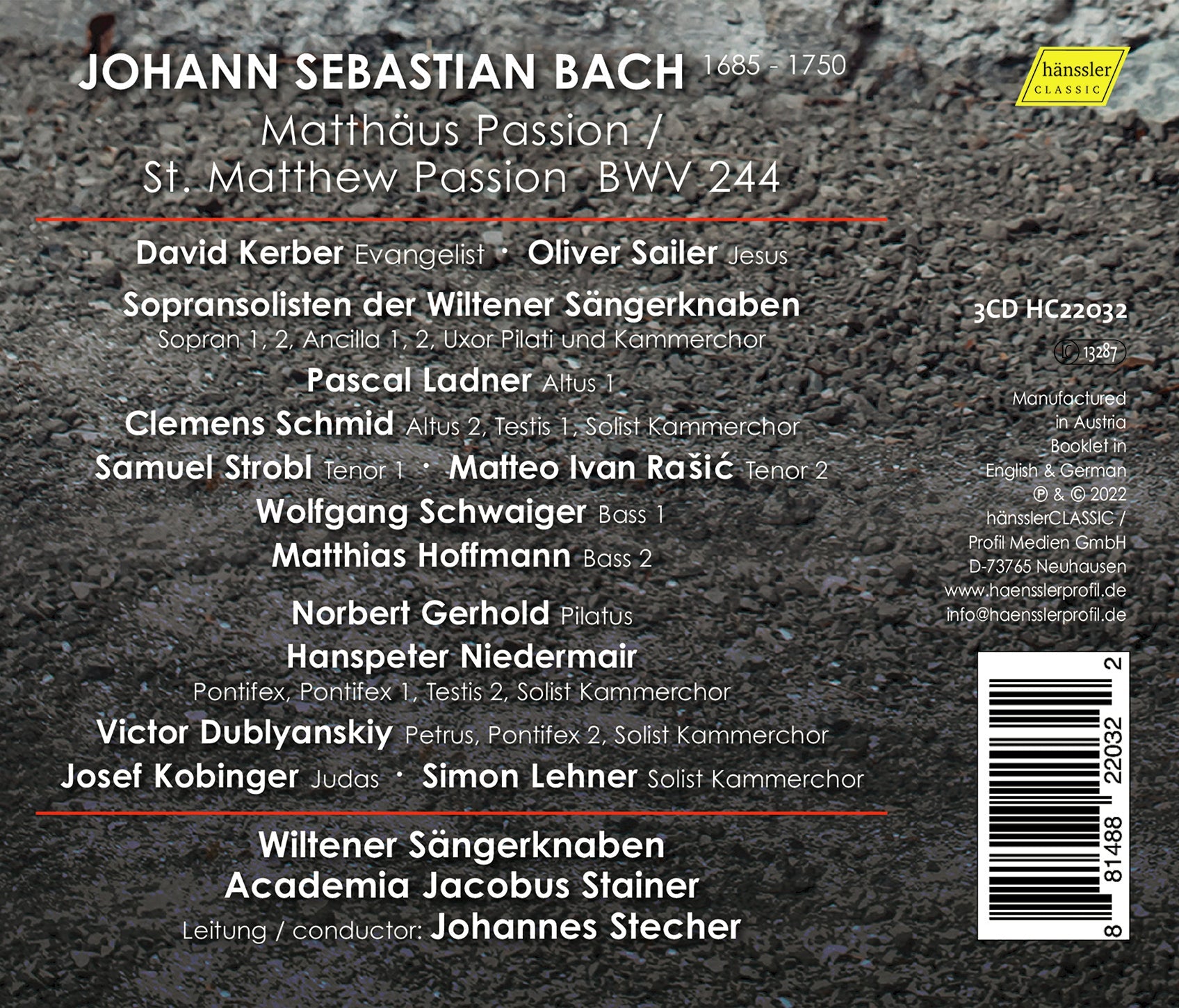 The choir and soloists of the Wilten Boys’ Choir and the Academia Jacobus Stainer Orchestra recorded the St. Matthew Passion in the middle of a lockdown during the Covid-19 pandemic, and were therefore tested daily and stood at a distance from each other in the Saal Tirol of the Congress Center in Innsbruck. The choir and the second orchestra were both further away from the conductor, just as was probably the case with Bach in the former St. Thomas Church with its swallow’s nest organ on a gallery above the triumphal arch. In any case, the St. Matthew Passion was performed in 1736 “mit beyden orgeln” (with both organs) in St. Thomas Church. We studied every recitative, every aria and every chorale as written in Bach’s wonderful handwriting and were amazed, especially in the secco recitatives, by some changes that became apparent for us after reading the meticulously written autograph that was later revised by Bach.
