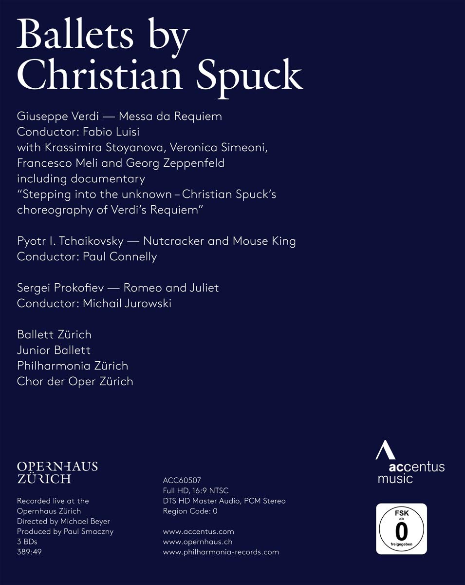 This box set contains three extraordinary ballet choreographies by the successful German choreographer Christian Spuck for the Ballett Zürich whose ballet director he has been since the 2012/13 season: Verdi’s Messa da Requiem conducted by Fabio Luisi, Tchaikovsky’s Nutcracker and Mouse King, conducted by Paul Connelly, and Prokofiev’s Romeo and Juliet conducted by Michail Jurowski. Christian Spuck comes from Marburg and was trained at the John Cranko School in Stuttgart. He began his dance career with Jan Lauwers’ Needcompany and Anne Teresa de Keersmaeker’s Ensemble Rosas. In 1995 he became a member of the Stuttgart Ballet and served as the company’s resident choreographer from 2001 to 2012. In Stuttgart he created fifteen world premieres, including the story ballet Lulu. Eine Monstretragödie after Frank Wedekind, Der Sandmann and Das Fräulein von S. after E.T.A. Hoffmann. Since the 2012/13 season, Christian Spuck has been director of Ballett Zürich.