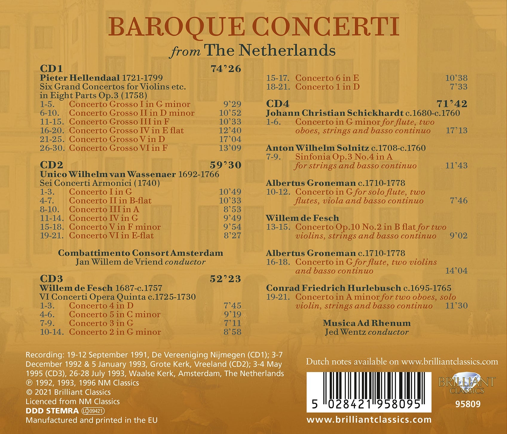 The 18th-century Dutch Republic served as a magnet attracting musicians across Europe. It was one of the wealthiest of European countries. Celebrities such as Handel and Mozart may have passed through only briefly, but others such as Locatelli made a permanent home in the republic and introduced many foreign musical languages to local composers. Hence, in this unique collection, we find a remarkable diversity of style, from Wassenaer's post-Corellian concerti grossi to the more galant music of Albertus Groneman. Meanwhile Willem de Fesch and Pieter Hellendaal moved to England and never returned to their homeland. Hellendaal’s ‘grand concertos’ are likewise Italian in style, though cast in a ripieno idiom whereas de Fesch’s concertos draw on his expertise as a solo violinist, rooted as much in the heritage of Vivaldi as Corelli. Most of the concertos on album 4 were composed by foreign arrivals: itinerant musicians such as the German-born Johann Christian Schickhardt and Anton Wilhelm Solnitz of Bohemian origins. The performances here, made in the 1990s and early 2000s and originally issued on the Dutch NM Classics label, enjoy a lively but not doctrinaire appreciation of historically informed style. Although the Combattimento Consort uses modern instruments, they play them implementing the techniques that van Wassenaer and Ricciotti would have known. The sound the players generate is therefore old and new, and should offend neither camp in the current round of period-instrument wars. Musica ad Rhenum, familiar from their considerable Brilliant Classics catalogue, play on instruments of the era or copies thereof. They are renowned among the most stylish of Dutch early-music groups. “The interpretations brim with verve and lucidity… de Vriend and his compatriots execute these works with excellent definition, a fine sense of shape and balance, and musical intelligence.” (Fanfare)
