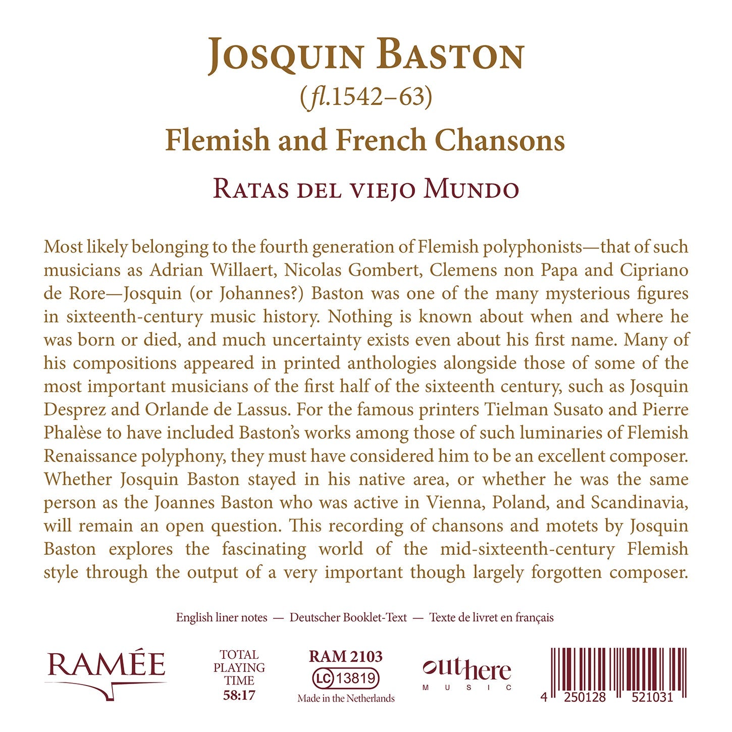 Most likely belonging to the fourth generation of Flemish polyphonists — that of such musicians as Adrian Willaert, Nicolas Gombert, Clemens non Papa and Cipriano de Rore — Josquin (or Johannes?) Baston was one of the many mysterious figures in sixteenth-century music history. Nothing is known about when and where he was born or died, and much uncertainty exists even about his first name. Many of his compositions appeared in printed anthologies alongside those of some of the most important musicians of the first half of the sixteenth century, such as Josquin Desprez and Orlande de Lassus. For the famous printers Tielman Susato and Pierre Phalèse to have included Baston’s works among those of such luminaries of Flemish Renaissance polyphony, they must have considered him to be an excellent composer. Whether Josquin Baston stayed in his native area, or whether he was the same person as the Joannes Baston who was active in Vienna, Poland, and Scandinavia, will remain an open question. This recording of chansons and motets by Josquin Baston explores the fascinating world of the mid-sixteenth-century Flemish style through the output of a very important though largely forgotten composer.
