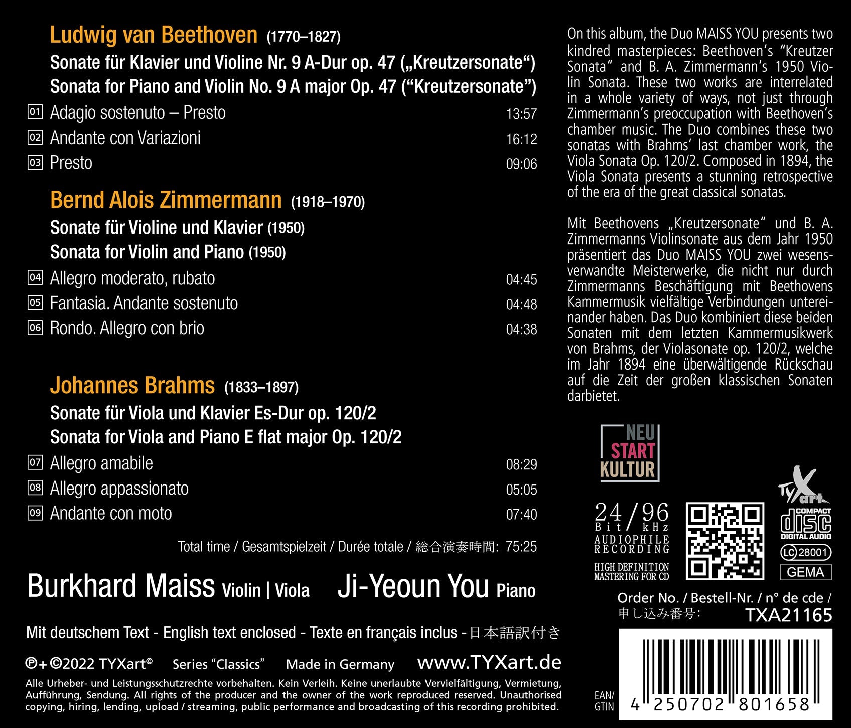 The magic, enigma and uniqueness of Ludwig van Beethoven’s (1770–1827) Sonata “Kreutzer” in A major Op. 47 have influenced not only music history but also literature from Tolstoy to Dürrenmatt, and it takes a long search to find a chamber music work that has a similar nimbus. Wild and untamed not only the work itself but also its history of creation appears. Beethoven wrote the “Kreutzer Sonata” for the violinist George Bridgetower (1778–1860), who spent some time in Vienna in 1803 and became friends with Beethoven. After an unusually short period of creation by Beethoven’s standards, the sonata was premiered at the Augarten in Vienna by Bridgetower and the composer at the piano. Bernd Alois Zimmermann (1918–1970) was the great loner of classical music in Germany after the end of the war and wrote one of the most interesting chamber music works of those years with the Violin Sonata from 1950. Zimmermann has spent his entire life dealing with Beethoven and his music is often interwoven with Beethoven’s work, so that a coupling of the sonatas is obvious. The Violin Sonata (1950) is a great example of his “pluralistic” compositional style in which different styles, past and present merge. While Beethoven and Zimmermann are indeed looking to the future with their works, Johannes Brahms' (1833–1897) Viola Sonata in E flat major Op. 120/2 is a work of retrospect. Brahms had announced “two modest sonatas” for clarinet after his new encounter with clarinetist Richard Mühlfeld in Ischl/Austria in the summer of 1894, and conceived his last two instrumental works simultaneously for viola and piano. The Sonata in E flat major is Brahms' last instrumental work, followed only by the “Four Serious Songs” and the chorale preludes op. 122.