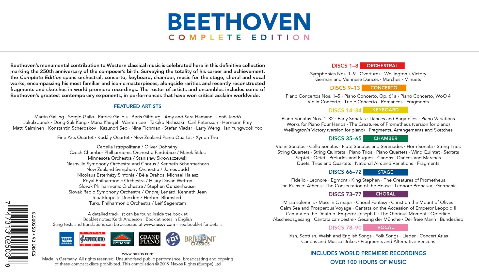 Naxos presents the Beethoven Complete Edition, a special 90-disc boxed set celebrating the composer’s 250th birth anniversary in 2020. Containing over 100 hours of music and over 1,550 tracks, the box features outstanding interpretations by soloists, chamber ensembles, orchestras and conductors. From Beethoven’s popular works to a host of sketches, drafts, transcriptions and reconstructions – this is the most complete collection of Beethoven’s works available in the market.