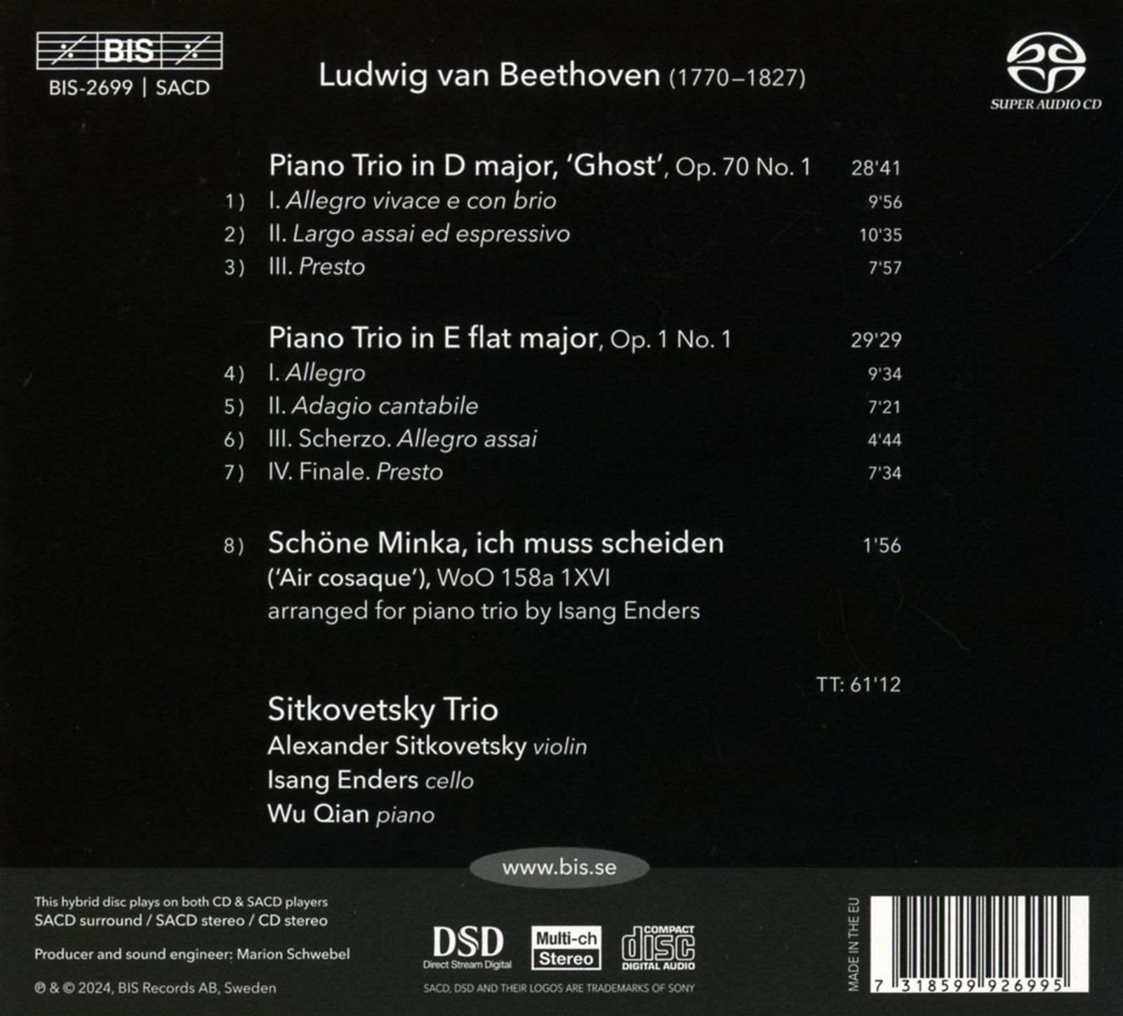 With the three piano trios published in 1795, Op. 1, Ludwig van Beethoven took a genre still largely associated with salon music and raised it up to rival the string quartet. In these works Beethoven saw the true start of his creative journey. Likely to have been composed (at least in a preliminary version) before his move from his native Bonn to Haydn and Mozart's Vienna, the Trio in E flat major, Op. 1 No. 1, reveals a composer who, while still drawing inspiration from his illustrious elders, begins to display his own witty personality marked by impish, sometimes tigerish playfulness. Composed about fifteen years later, the two Op. 70 trios 'raise the genre to a level from which the later piano trio literature could move forward' in the words of Beethoven specialist Lewis Lockwood. Indeed, they clearly made a mark on the later trios of Schumann, Brahms and Tchaikovsky. The first of them, played here, is the more significant. It's nickname, 'Ghost', refers to it's unsettling central movement characterized by 'horror' writing, displaying a range of chilling effects. The recording concludes with an arrangement by the trio's cellist, Isang Enders, of a catchy and eloquently simple Ukrainian Cossack tune from a collection of Beethoven's folk song arrangements that Schubert would no doubt have loved.
