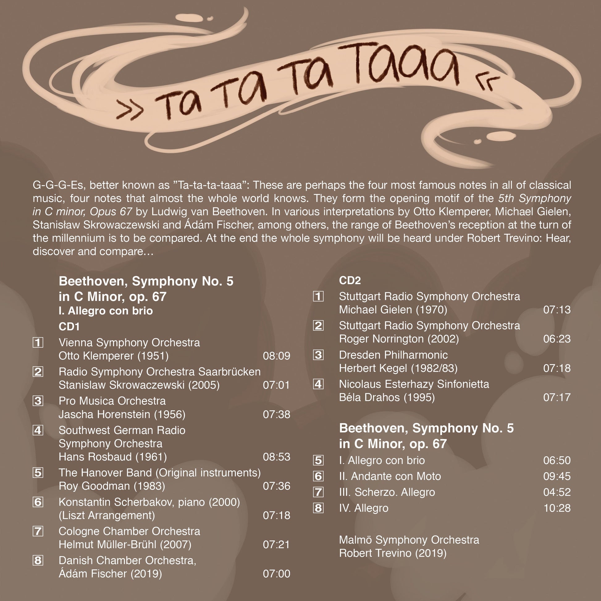 Three Gs and an E flat, declaimed Ta-ta-ta-taaa!, is perhaps the best known phrase in all of classical music. The notes form the opening motif of Beethoven’s Fifth Symphony, a work that has enjoyed enduring popularity since its first performance in 1808.This album presents various interpretations the symphony’s opening movement has received from a number of conductors, including Otto Klemperer (1885–1973), Michael Gielen (1927–2019), Stanisław Skrowaczewski (1923–2017) and Ádám Fischer (b. 1949), giving the listener convenient comparisons and historic hindsight. Additionally, Robert Trevino conducts the Malmö Symphony Orchestra in a recording of the complete work, while Konstantin Scherbakov complements the collection with a performance of Liszt’s transcription of the work for solo piano.