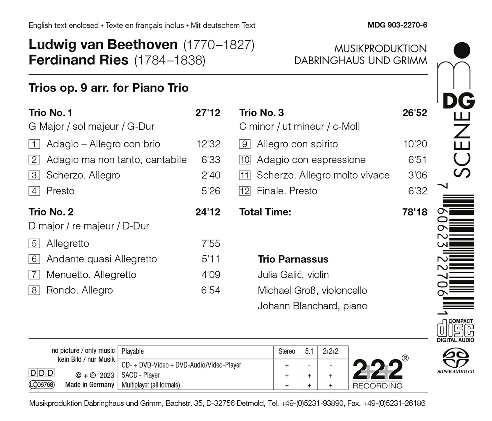 Trio Parnassus inspires audiences with their gripping virtuosity as well as their shaping of sensitive passages. This high-quality world premiere recording should convince even the most critical Beethoven admirers! (MDG-Gold)