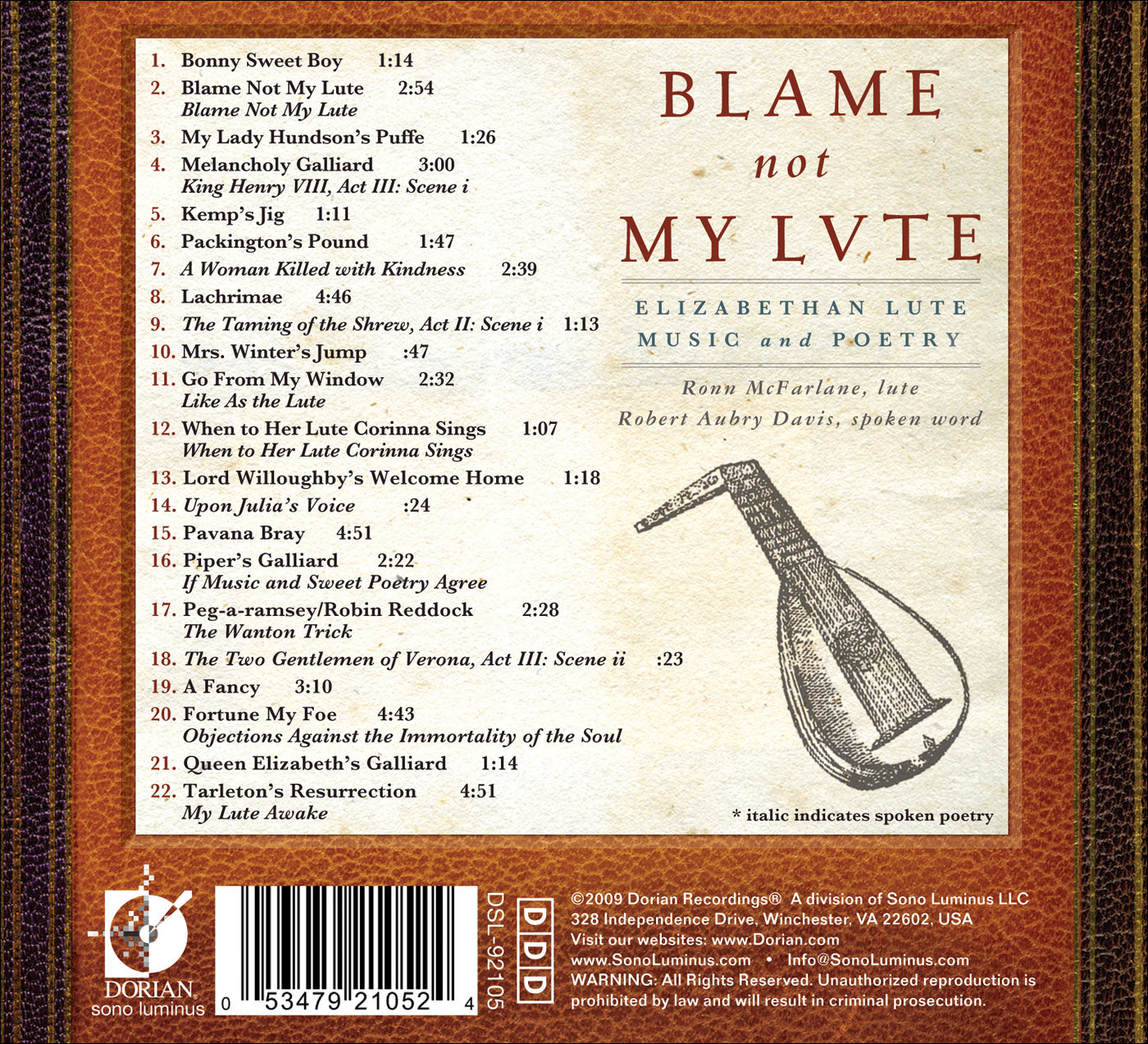This is something of a concept album. It’s also a programme that has been toured and performed in concert many times and reaches fruition as a disc. It takes Elizabethan and Jacobean lute music and marries it to the poetry and theatre of the time. Sometimes a single track is given over to verse or a short scene from a play, spoken by Robert Aubry Davis; but also we hear a speech or lyric spoken above, as it were, lute accompaniment. This sometimes makes things difficult to judge artistically vis a vis Ronn McFarlane’s lute playing, but it’s a disc to be measured against a rather wider canvass than usual, a multi-disciplinary words and music presentation.
