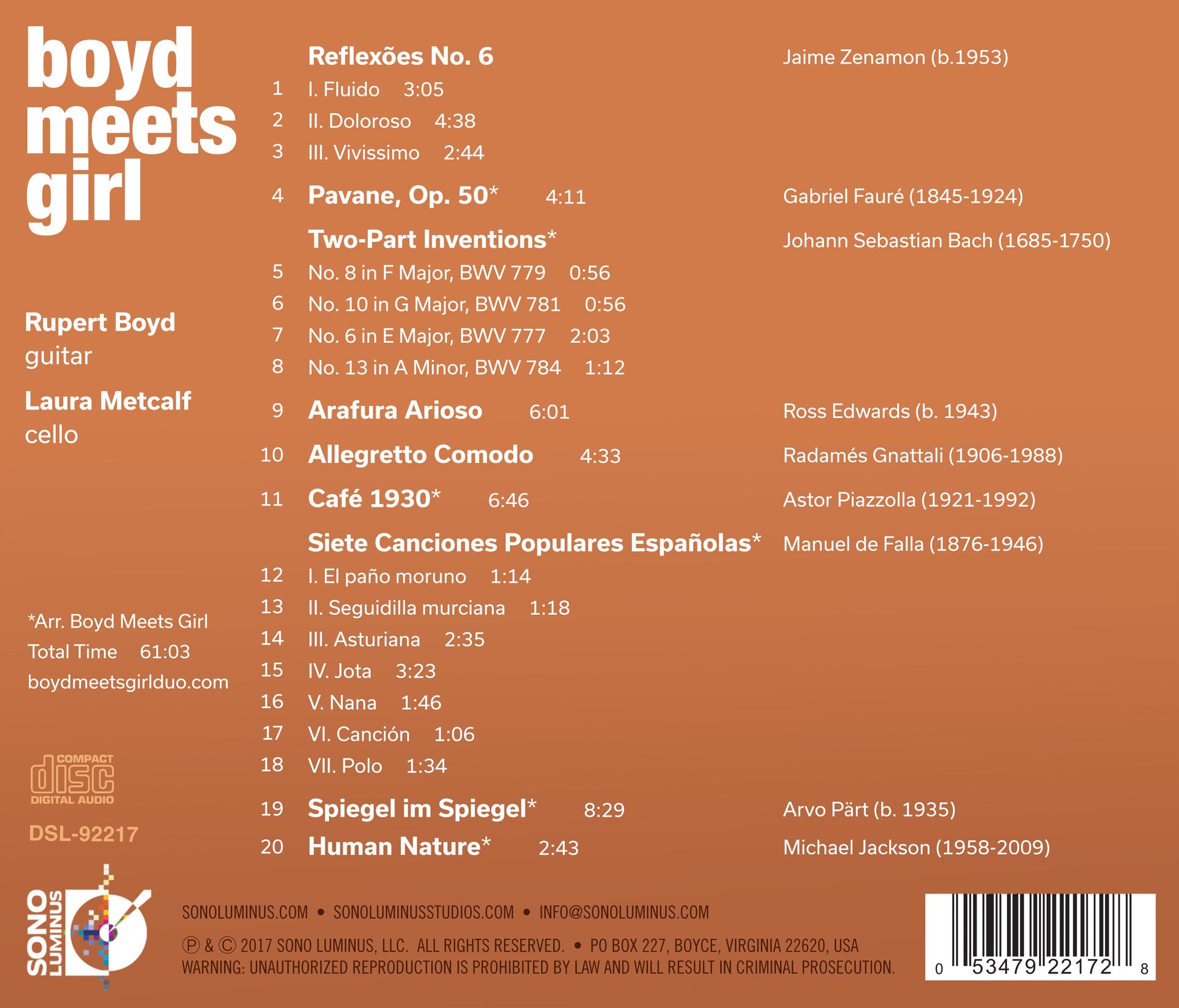 Boyd Meets Girl pairs Australian classical guitarist Rupert Boyd with American cellist Laura Metcalf. Acclaimed soloists in their own right, as a duo they perform an eclectic and engaging range of repertoire, from the baroque through modern day, including many of their own arrangements. Boyd has been described as “truly evocative” by The Washington Post, and as “a player who deserves to be heard” by Classical Guitar Magazine, while Metcalf, also a member of the ensembles Sybarite5 and Break of Reality, has been called “brilliant” by Gramophone. Boyd Meets Girl has toured throughout the USA, Australia, India and Nepal, including appearances at the Newport Music Festival (Rhode Island), the Gharana Music Festival (Kathmandu, Nepal) and the Monsoon Music Festival (Kolkata, India). The duo writes of this release: “Our debut album is a lovingly curated musical journey, encompassing both our shared perspective on beloved works and relatively unknown repertoire we believe is equally deserving of attention. This album features our own arrangements, including a reduction of Faure's adored Pavane from its orchestral original, and Bach's solo keyboard inventions re-imagined on cello and guitar. These are presented alongside contemporary works, including a colorful three-movement piece by Bolivian composer Jaime Zenamon, and the debut recording of Arafura Arioso by esteemed Australian composer Ross Edwards. The entire album is designed to highlight the range and of timbral possibilities of this under-explored instrumental pairing. Our collaboration began as a romantic relationship in 2012. We are now happily married and live in New York City.”