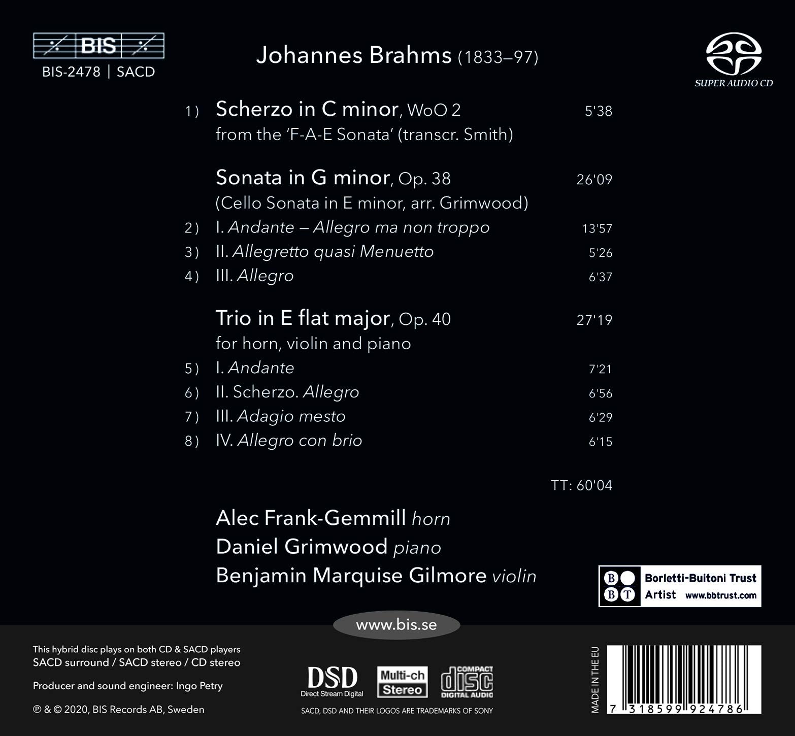 The horn was one of the instruments that Johannes Brahms learned in his youth, from his father who played it professionally. His fondness and familiarity with the instrument is clear from the glorious solos that he provided it with in his symphonies, and he gave it pride of place in the Horn Trio that he wrote in memory of his mother Christiane. Even so, he never composed any other chamber work involving the horn – an oversight that horn players have regretted ever since. Following up on two highly acclaimed BIS albums, Alec Frank-Gemmill decided to rectify this, and enlisted the help of pianist Daniel Grimwood and violinist Benjamin Marquise Gilmore. It goes without saying that the resulting disc includes the Horn Trio – which Frank-Gemmill has chosen to perform on the instrument played by Aubrey Brain on his legendary 1933 recording of the work. But leading up to this are two works originally written for violin and cello respectively. The sometimes controversial subject of transcriptions is discussed by Frank-Gemmill in his liner notes where he also explains his selection of works. In the Scherzo that Brahms wrote as his contribution to the F-A-E Sonata (which also included movements by Schumann and Albert Dietrich), he finds that the very fabric of the piece is made up of horn calls, while the galloping 6/8 theme reminds him of the final movement of the horn trio. Wanting to also include a sonata, Frank-Gemmill settled on the E minor Cello Sonata, Op. 38 as the one best suited for the horn, and together with arranger Daniel Grimwood the decision was made to transpose the work a third up, into G minor. Through their efforts, we are able to present a Brahms recital that hornists – and the rest of us – could only dream of.