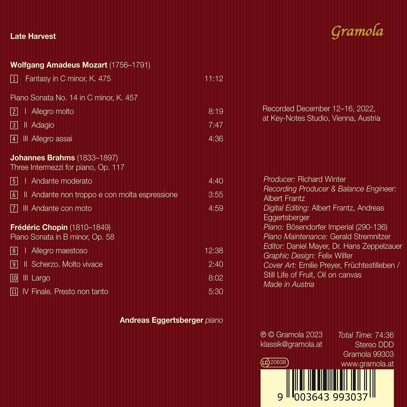 The pianist Andreas Eggertsberger, who studied in Austria and the USA with Karl Heinz Kämmerling and Oleg Maisenberg, among others, deals with the late works of three composers on his new album “Spätlese” (Late Harvest): Wolfgang Amadeus Mozart, Johannes Brahms and Frédéric Chopin. Whether a work is considered a late work has less to do with the composer’s age and more to do with where the breaking points and further developments are in a composer’s oeuvre. Some of the three selected masters were still young when they entered their late phase: Mozart was in his late twenties when he composed his Fantasia K. 475 and Sonata in C minor K. 457, Chopin was thirty-four when he composed his third and final Sonata in B minor, and Brahms was fifty-nine when he composed his Three Intermezzi Op. 117. Many a future is anticipated. Mozart, for example, builds a bridge to Beethoven with his Fantasy and Sonata in C minor. Chopin, on the other hand, takes a look at late Romanticism and beyond with his increasingly bold harmonies, and Brahms foreshadows musical developments that would only become influential in the 20th century.