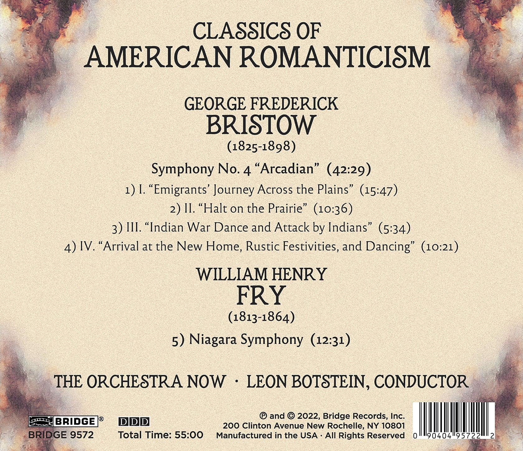 George Frederick Bristow and William Henry Fry constituted the first generation of major, native-born composers of instrumental music in the United States. Both were fierce proponents for American music as composers, writers, and performers. Of particular note: Bristow's Symphony No. 4 the "Arcadian" is recorded here in its entirety for the first time. The 1967 recording made by Karl Krueger with the Royal Philharmonic Orchestra made large cuts in the first and last movements, reducing the length of the piece by at least ten minutes.