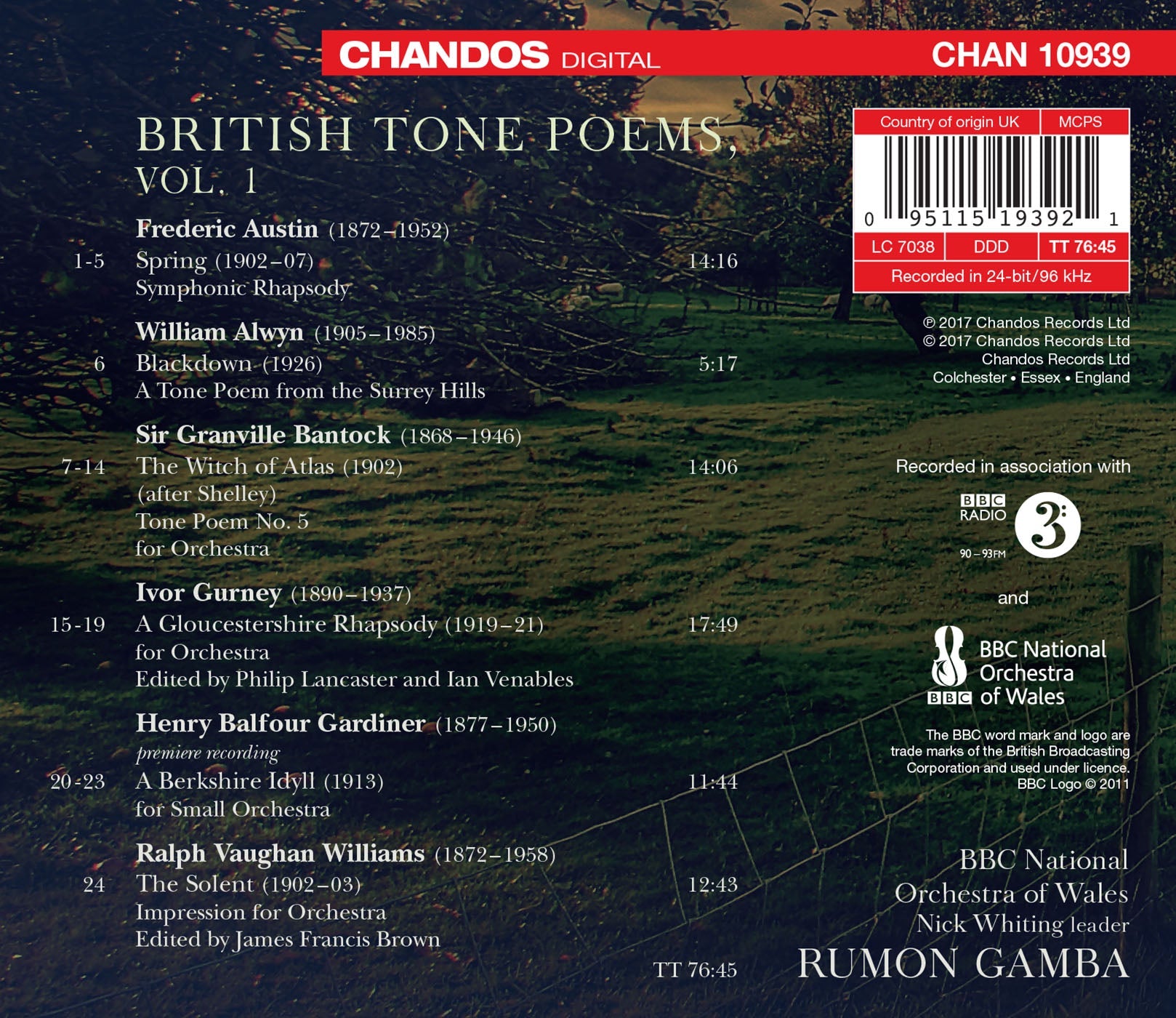 Alongside their British Isles Overtures series, the BBC NOW and the conductor Rumon Gamba launch a project to bring often neglected symphonic poems by British composers to wider attention and fame. This first volume presents some of the most individual, yet rarely heard, British tone poems written in the early twentieth century, by composers ranging from the long-established Ralph Vaughan Williams and William Alwyn to Balfour Gardiner and Granville Bantock, giants in their time. Works include Bantock's atmospheric The Witch of Atlas, based on a poem by Shelley, Frederic Austin's symphonic rhapsody Spring, Gardiner's evocatino of summer A Berkshire Idyll, recorded here for the first time, and Gurney's mysterious A Gloucestershire Rhapsody, never performed before 2010.