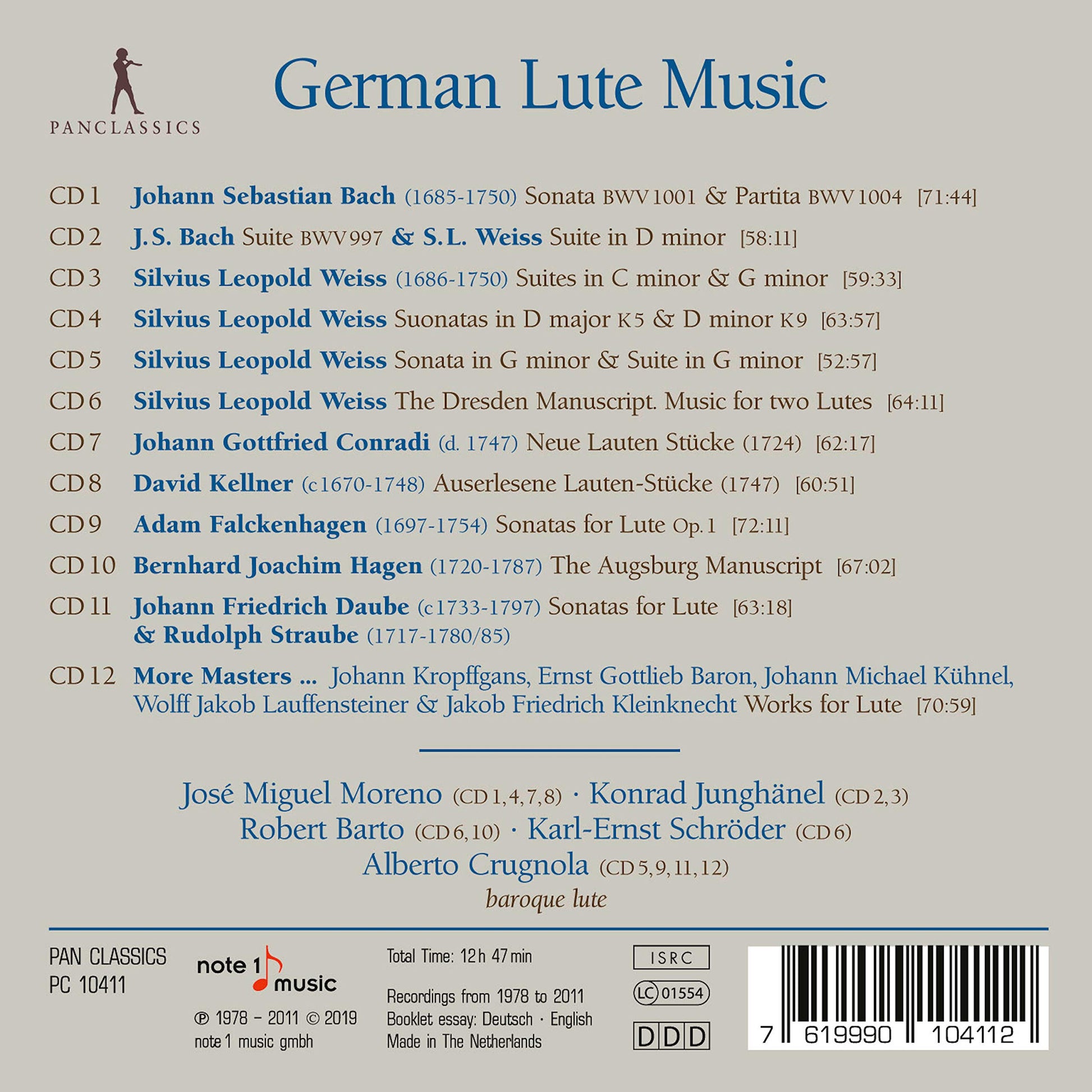 The cornerstone of this anthology is the renowned Silvius Leopold Weiss who exerted an influence on entire generations of lutenists with his outstanding compositions. A major regional focus here is Bayreuth, the cultural center so important for the lute, as well as the Saxon-Silesian surroundings around Johann Sebastian Bach in Leipzig. The collection also includes compositions originating from the final generation of German lutenists during the second half of the 18th century. World renowned lutenists perform here on the baroque lute with superb historical performance practice. Artists include Jose Miguel Moreno, Konrad Junghanel, Robert Barto, Karl-Ernst Schroder, and Alberto Crugnola.