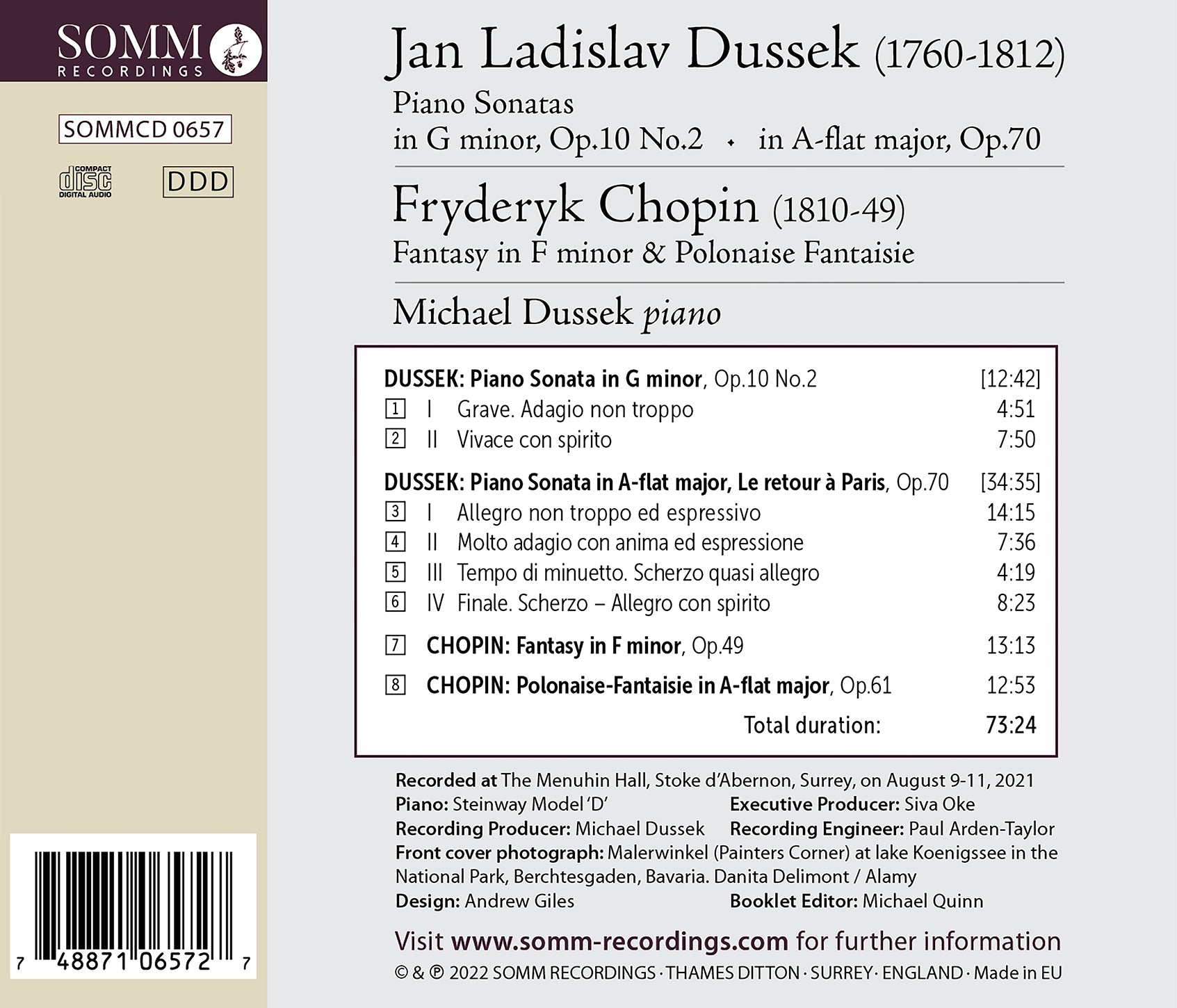 Volume II focuses on music composed during the period 1789 to 1846 spanning the early years of Dussek’s compositional career and the final years of Chopin’s. Dussek’s early Sonata in G minor (Op.10 No.2) from 1789 already shows the Bohemian composer pushing against inherited norms and reaching towards the testing of form and extreme keyboard ranges that would color his music over the next 20 years, combining, as Dussek says in his insightful booklet notes, “virtuosic fingerwork [that] alternates with operatic dialogue”. His Op.70 Sonata in A flat, Le retour à Paris, from 1805 “in every way breaks new ground” to produce “a thrilling tour de force setting new standards in virtuosic piano writing”. The two companion Chopin pieces – the Fantasy in F minor (Op.49) and Polonaise-Fantaisie in A flat (Op.61) – have been chosen “to emphasize the similarities of piano sonority and harmony” between the two composers. Their inclusion points to Dussek’s guiding aim of the series: “simply to demonstrate the influence, in my view undeniable and at least partially unrecognized, of [Jan Ladislav] Dussek on the great Polish composer [Chopin]”.