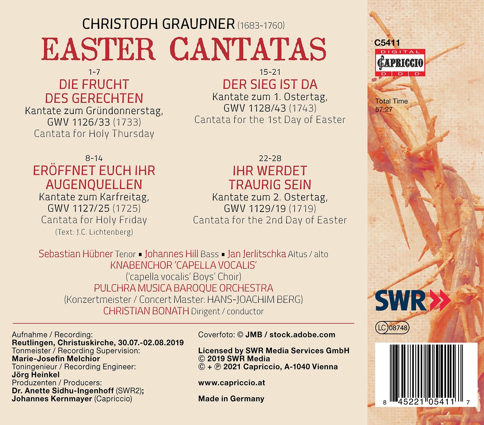 In 1711 Christoph Graupner was already appointed court conductor and he would continue to work in Darmstadt for the rest of his life. Graupner’s focus shifted to sacred vocal music, which explains the sheer abundance of the 1,400-plus cantatas he composed. In 1723 the Leipzig city magistrates were looking for a new cantor at the Thomas School – and wanted him, above all. Alas, Graupner’s patron did not release him from his contract an so they had to hire Bach. Graupner, famous and widely celebrated during his lifetime, was soon thereafter forgotten. As we rediscover and hear more and more of his works, however, the judgment of his contemporaries would appear to us as increasingly germane. The present recording spans the liturgical arc from Maundy Thursday via Good Friday and Easter Sunday to Easter Monday and presents one liturgical work for each of the festive days – and each of them a world premiere recording!