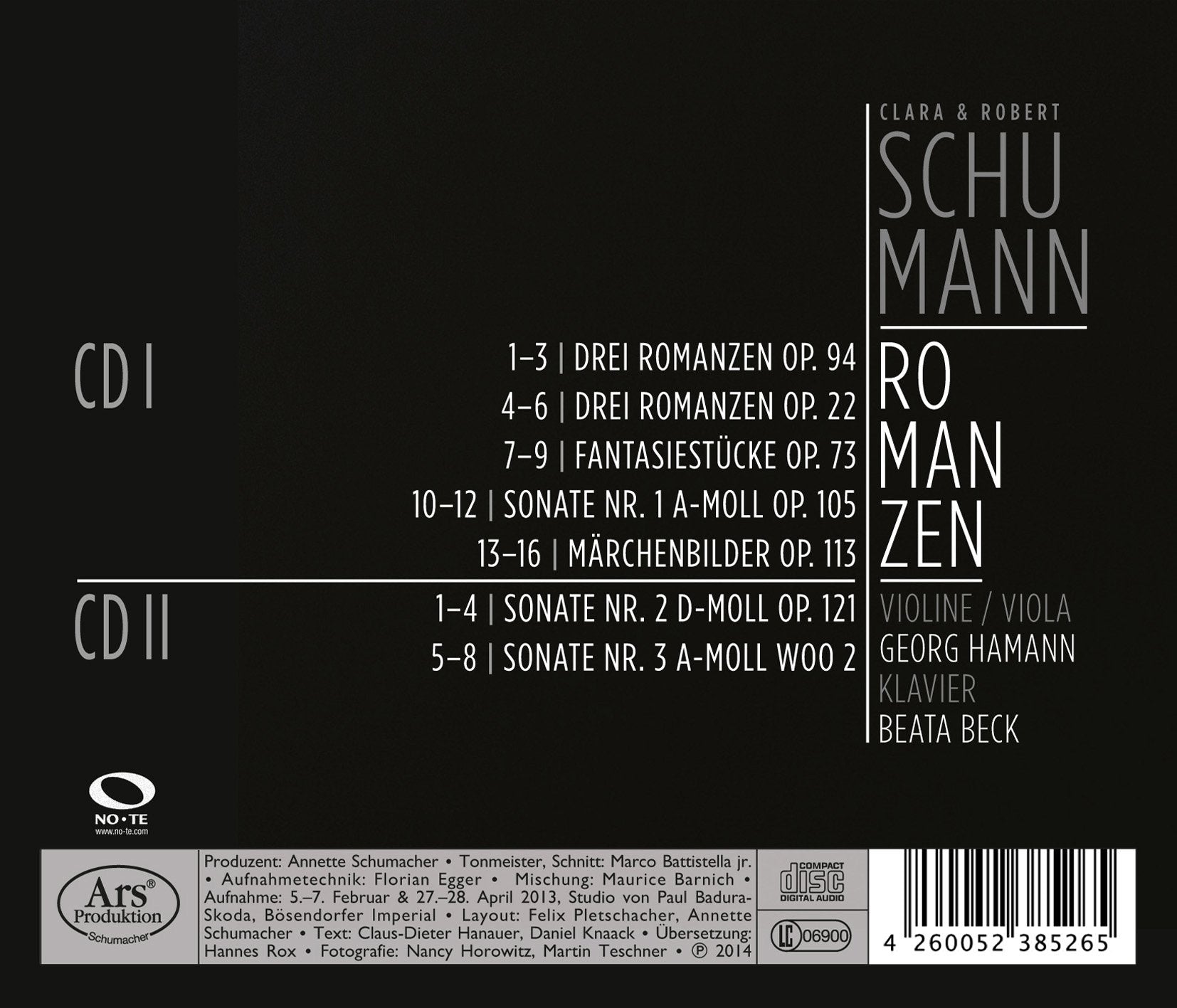 •For this ARS PRODUKTION double-CD, violinist/violist Georg Hamann and pianist Beata Beck have recorded the complete complex of works for, or transcribed for, violin or viola and piano of Robert Schumann and the Three Romances, op. 22 by Clara Schumann. Georg Hamann (b. 1960) is principal violist of the Vienna Chamber Orchestra. _x000D_