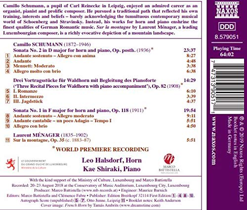 Camillo Schumann, a pupil of Carl Reinecke in Leipzig, enjoyed an admired career as an organist, pianist and prolific composer. He pursued a traditional path that reflected his own training, interests and beliefs- barely acknowledging the tumultuous contemporary musical world of Schoenberg and Stravinsky. Instead, his works for horn and piano enshrine the finest qualities of German Romantic music. Sur la montagne by Laurent Menager, a leading Luxembourgian composer, is a richly evocative depiction of a mountain landscape.