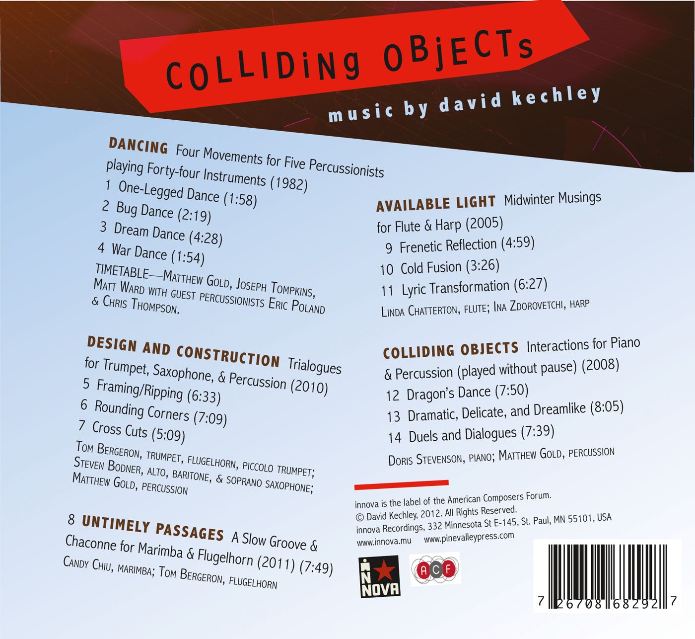 Award-winning composer David Kechley mines the intimate in order to find the dramatic, eschewing volume and mass in favor of tension and melodic invention of the works on this disc. This extends to the instrumentation, which includes creative percussion such as circular saw blades and pine planks cut to different lengths in “Design and Construction” or the pitched gongs, crotales, woodblocks, and exotic bells of the title track.