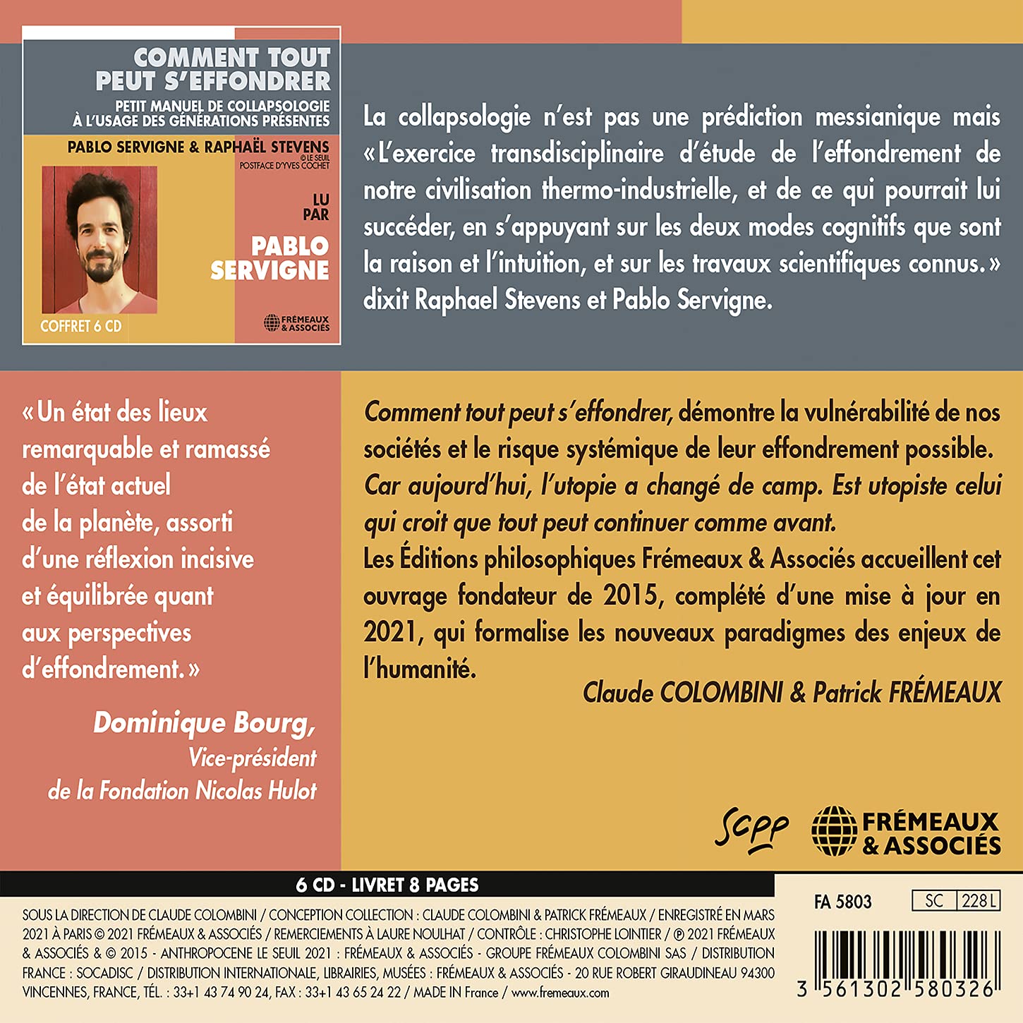According to Raphael Stevens and Pablo Servigne, collapsology is not a messianic prediction but: "the transdisciplinary exercise of studying the collapse of our thermo-industrial civilization, and what might succeed it, based on the two cognitive modes of reason and intuition, and on known scientific work". Comment tout peut s'éffondrer ("How Everything Can Fall Apart") demonstrates the vulnerability of our societies and the systemic risk of their possible collapse. Because today, utopia has changed sides. A utopian is someone who believes that everything can continue as before. The Éditions philosophiques Frémeaux & Associés welcome this seminal work from 2015, completed by an update in 2021, which formalizes the new paradigms of the challenges facing humanity. Audiobook, in French.