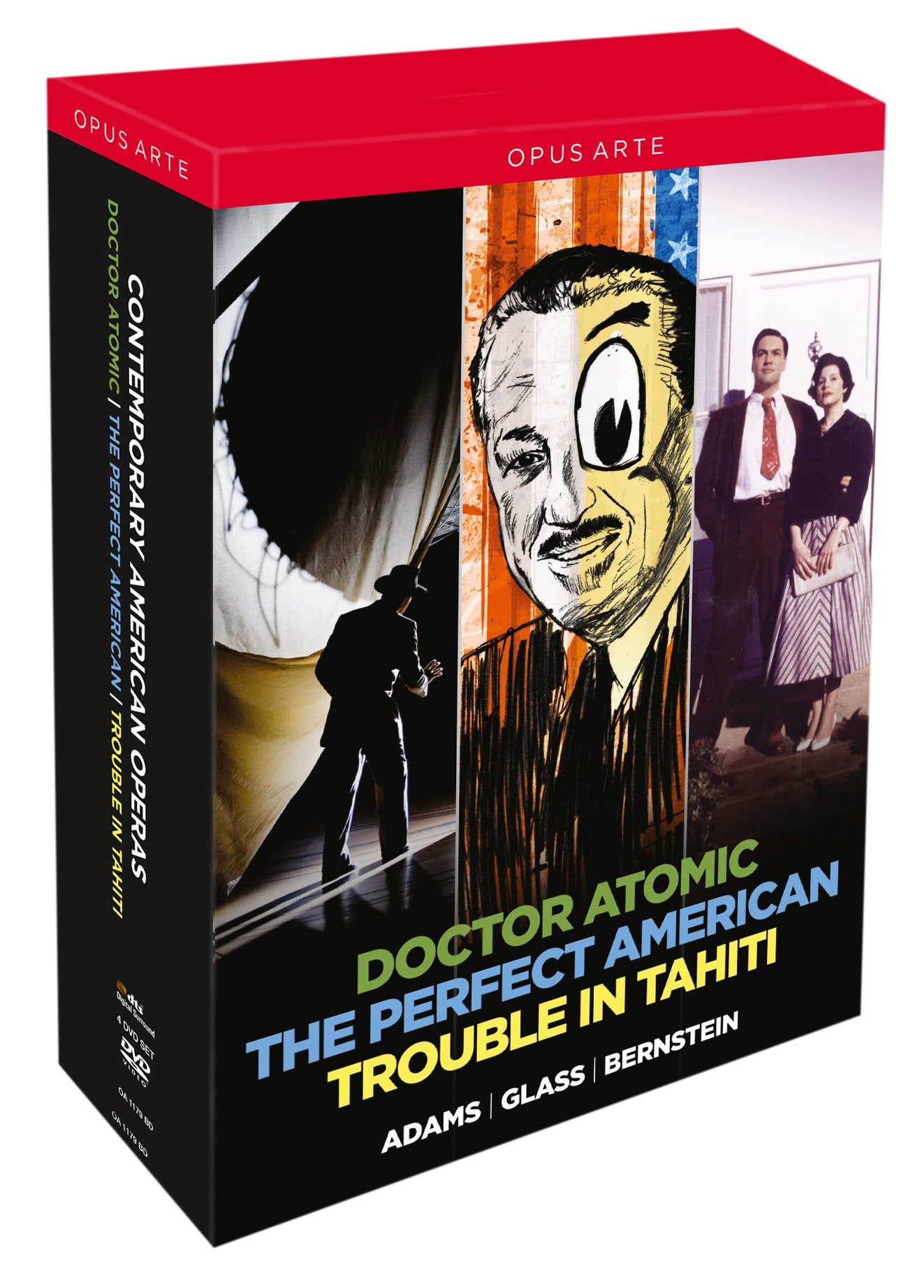 An extraordinary 4 DVD box set that brings together three of America’s most lauded contemporary opera productions that collectively are a brilliant introduction to the astonishing diversity of 20th-century opera : John Adams’ Dr. Atomic directed by librettist Peter Sellars, a riveting morality drama about the father of the atomic bomb, J. Robert Oppenheimer. Philip Glass’, The Perfect American, like the book from which it is based, seeks to reveal an unvarnished Walt Disney, based on an imagined series of reflections and memories that might have occurred during the icon’s dying months; and finally the 2001 cinematic film version of Trouble in Tahiti, Leonard Bernstein’s satire on American suburban married life, with the characteristically jubilant conjoining of jazz and musical comedy; lyric art with popular entertainment. A marvelous collection of consummate direction, compelling designs, a collection of inspired musical performances by the Netherlands Philharmonic, Madrid’s Orquesta de Teatro Real and City of London Sinfonia along with brilliant casting and stand-out performances – among them Gerald Finley’s Oppenheimer and Christopher Purves’ Walt Disney. Filmed in High Definition and recorded in true Surround Sound.