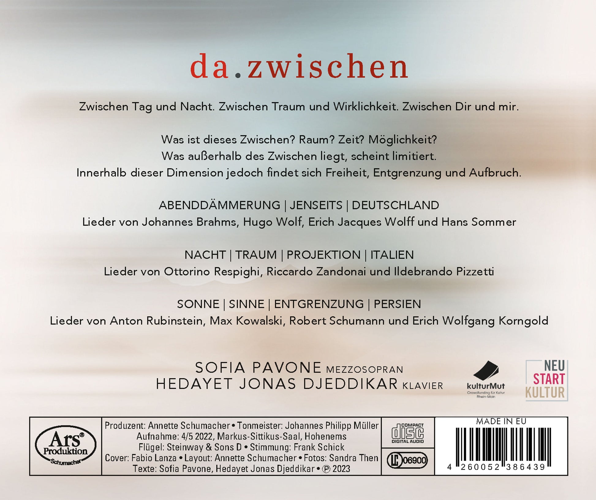 "Be welcome, twilight hour!" With these words, the song of the same name by Johannes Brahms welcomes the twilight. The special light and the mood that comes with it create space for a soulful experience that goes beyond earthly boundaries. Here we are already moving in the midst of it, there. between. We, Sofia Pavone and Hedayet Jonas Djeddikar, invite you there with us - for years we have been united in our work by a great passion for the art form of song. Interesting for us and very close to our own experience is the preoccupation with the concept of "in-between" - as German-Italians and German-Persians we each live between two cultures; this draws our attention especially to how many different kinds of in -between exist. Between day and night. / Between dream and reality. / Between life and death. / Between worlds. / Between you and me. What exactly is this in-between? Space? Time? Possibility? What lies outside the in-between seems limited, but within this dimension there is freedom, dissolution of boundaries and departure. In-between states, in-between worlds and in-between tones have always served as inspiration for artists in their confrontation with themselves, time, love and death: themes that can be found again in the art song, which combines linguistic-literary and musical means, and which show how, for poets and composers alike, the in-between is expressed in different ways.