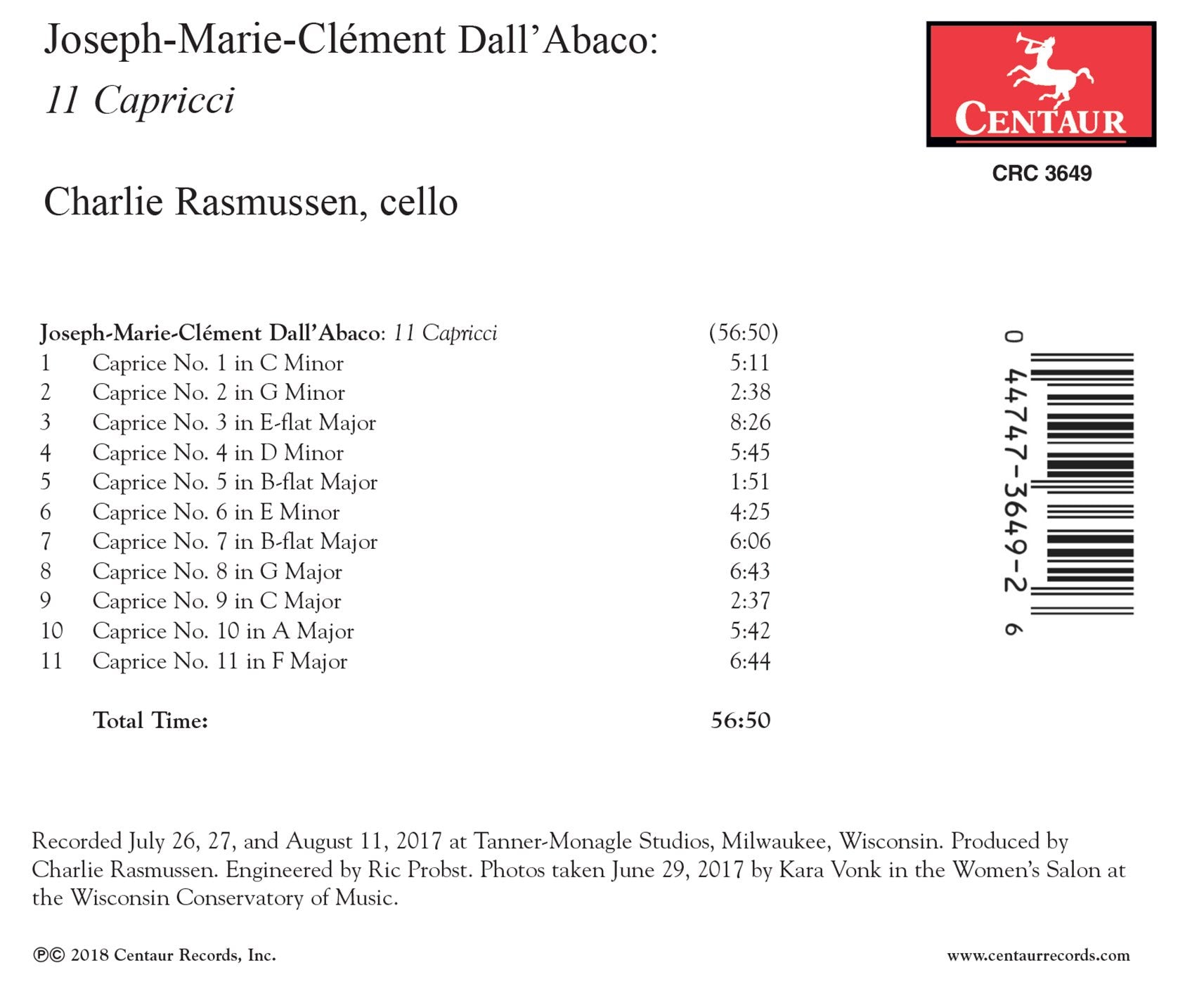 Joseph-Marie-Clement Dall'Abaco (1710 - 1805) was an Italian/Flemish composer and cellist. Little is known about his life, but we do know that he travelled and performed as a cellist. He also wrote for cello, and these works clearly show his great mastery. Performing these pieces is Charles Rasmussen. Charlie Rasmussen enjoys an active career as both a modern and Baroque cellist and as a teacher at the Wisconsin Conservatory of Music. Mr. Rasmussen was previously on faculty at the Talent Education Suzuki School in Norwalk, CT where he taught private and group cello lessons, musicianship classes, and coached chamber ensembles. Mr. Rasmussen strives to help his students develop a lifelong passion for music and cello playing. Mr. Rasmussen holds a Masters of Music in Cello Performance from the University of North Carolina, Greensboro (UNCG), where he was a graduate assistant and studied with Dr. Alexander Ezerman. He also received a Post-Baccalaureate Certificate in Music Theory from UNCG. Before his studies at UNCG, Mr. Rasmussen graduated magna cum laude with a Bachelor of the Arts degree in music from Luther College where he studied with Dr. Eric Kutz. Mr. Rasmussen studied the Suzuki Method with Carol Tarr at the University of Denver, and he is trained to teach Books 1-10 through the Suzuki Association of the Americas.
