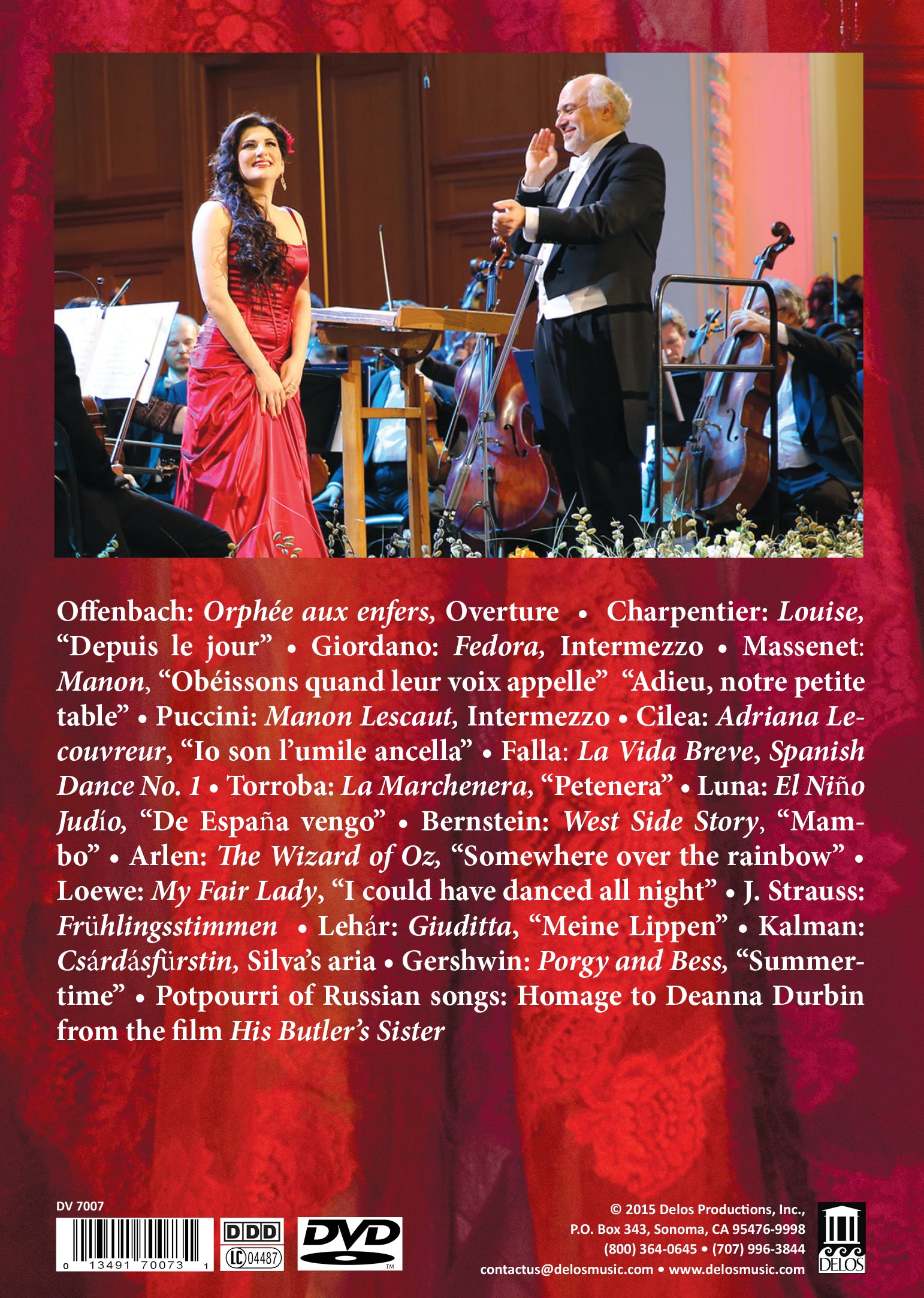 Rising superstar soprano Dinara Alieva – since 2010 a Bolshoi Opera mainstay – has been entrancing opera and concert audiences throughout Europe and elsewhere, appearing to consistent acclaim in major roles at many of the world’s top houses. This live concert video – following her highly successful prior CD release on Delos, Pace mio Dio (DE 3462) – showcases not only her voluptuous voice, interpretive power and stylistic versatility ... but also (thanks to the visual element) her stunning glamour and charismatic stage presence. The varied and highly appealing program encompasses operatic favorites from such composers as Charpentier, Massenet and Cilea – as well as lighter fare from the Spanish Zarzuela and Viennese operetta traditions plus several beloved popular standards. Woven through the vocal program is a series of scintillating orchestral bonbons courtesy of conductor Constantine Orbelian (per Opera News, “...the singer’s dream collaborator) leading the superb Russian National Orchestra and the vaunted Grand Choir, “Masters of Choral Singing.” “She is a wonder…a singer who possesses the gift of heaven.” (Monserrat Caballé)