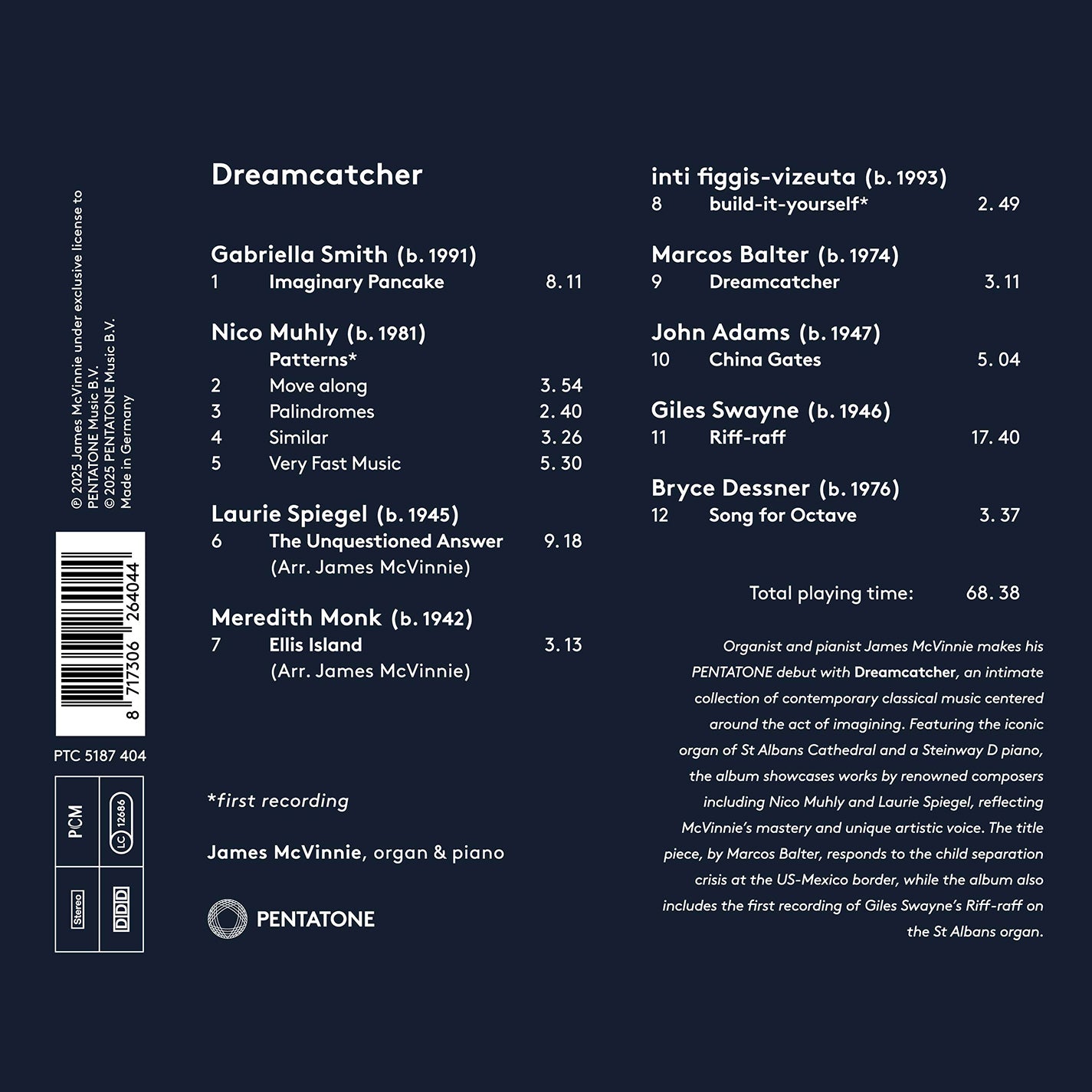 A mesmerising sonic trip, Dreamcatcher reflects the unique artistic persona of McVinnie, whose mastery of core organ repertoire extends to an extensive body of work written for him by leading contemporary classical composers, as well as collaborations in the world of electronic and experimental music. The album features works by Nico Muhly, Meredith Monk, Laurie Spiegel, John Adams, inti figgis-vizeuta, Gabriella Smith, Giles Swayne, Bryce Dessner & Marcos Balter. The album's title is taken from Marcos Balter’s work of the same name, written in response to the child separation crisis at the US-Mexico border in 2018—“dreamers” being the name given to children separated from their families by the Trump administration’s immigration policy. This record also presents the first ever recording of Giles Swayne's Riff-raff made on the St Albans organ for which the work was written in 1983—McVinnie’s rendition embodying a perfect synergy between the piece’s minimalist roots and the modernist tonal philosophy of this instrument.