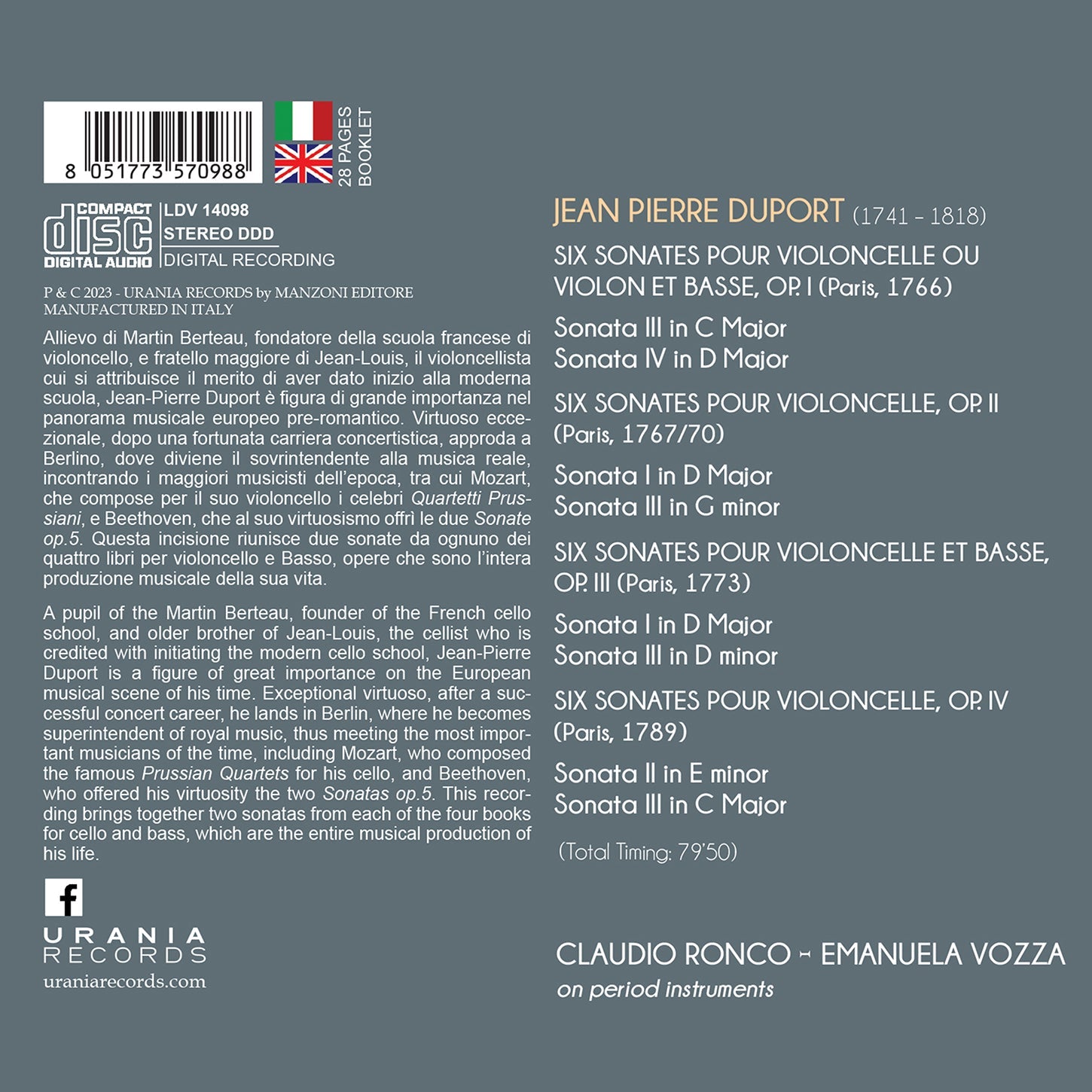 A pupil of the Martin Berteau, founder of the French cello school, and older brother of Jean-Louis, the cellist who is credited with initiating the modern cello school, Jean-Pierre Duport is a figure of great importance on the European musical scene of his time. Exceptional virtuoso, after a successful concert career, he lands in Berlin, where he becomes superintendent of royal music, thus meeting the most important musicians of the time, including Mozart, who composed the famous Prussian Quartets for his cello, and Beethoven, who offered his virtuosity the two Sonatas op.5. This recording brings together two sonatas from each of the four books for cello and bass, which are the entire musical production of his life.