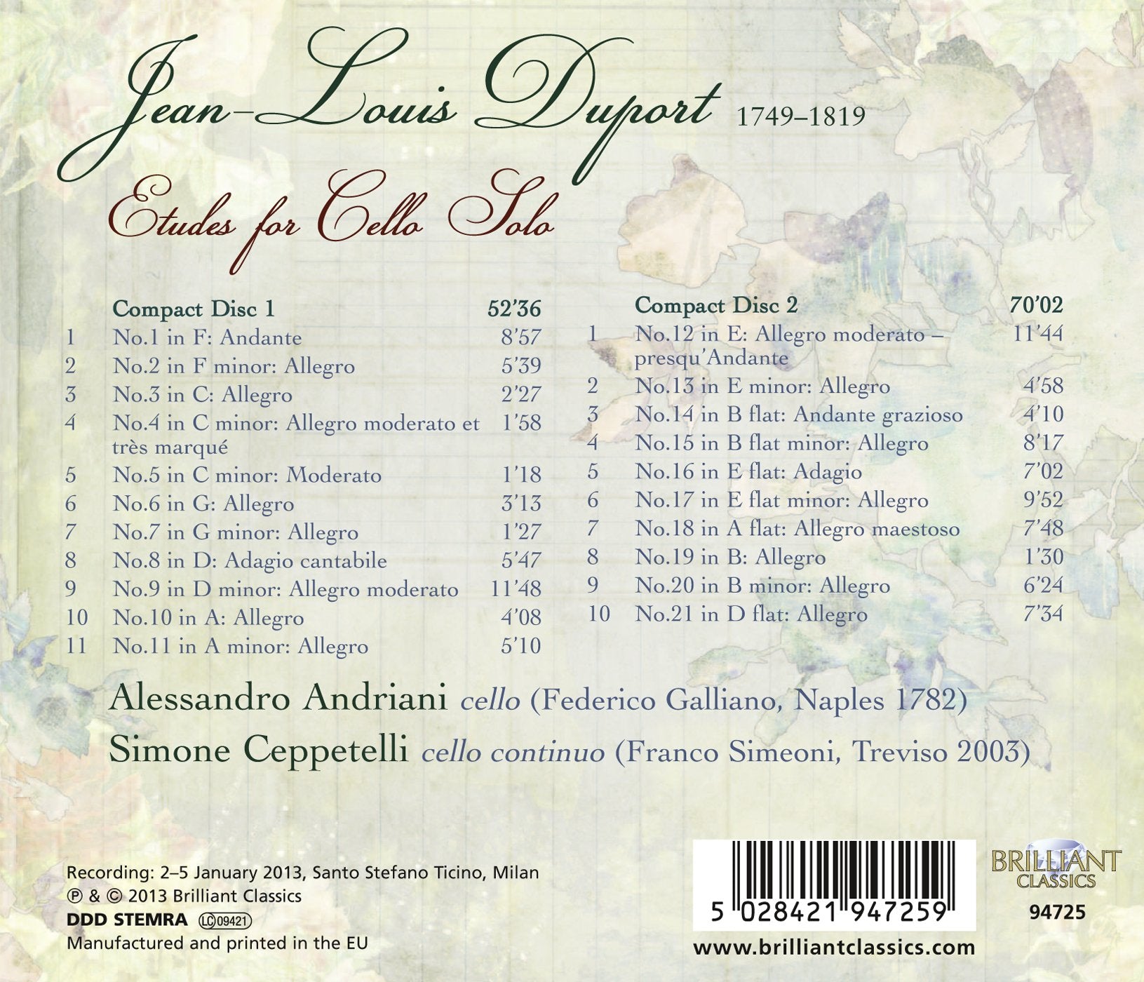 Born in Paris in 1749, Jean-Louis Duport, cellist and composer, also known as 'le jeune' -- to distinguish him from his elder brother Jean-Pierre (1741--1818), called 'l'ainé' -- is today regarded as one of the most important figures in the history of the development and evolution of cello technique. In 1806 he published his cello treatise Essai sur le doigté du violoncelle et sur la conduite de l'archet, a work that became the fundamental reference point for all subsequent schools of cello teaching. At the end of the treatise, we find the 21 Etudes for Violoncello (with a second cello part as accompaniment), works that explain and put into practice the methods described within. They are very difficult, highly virtuosic exercises that present a wide selection of tones and bowings as well as an extraordinary richness of compositional ideas, and in this way the Essai can be viewed as an anthology of concert pieces with real artistic value rather than just a mere practical handbook.