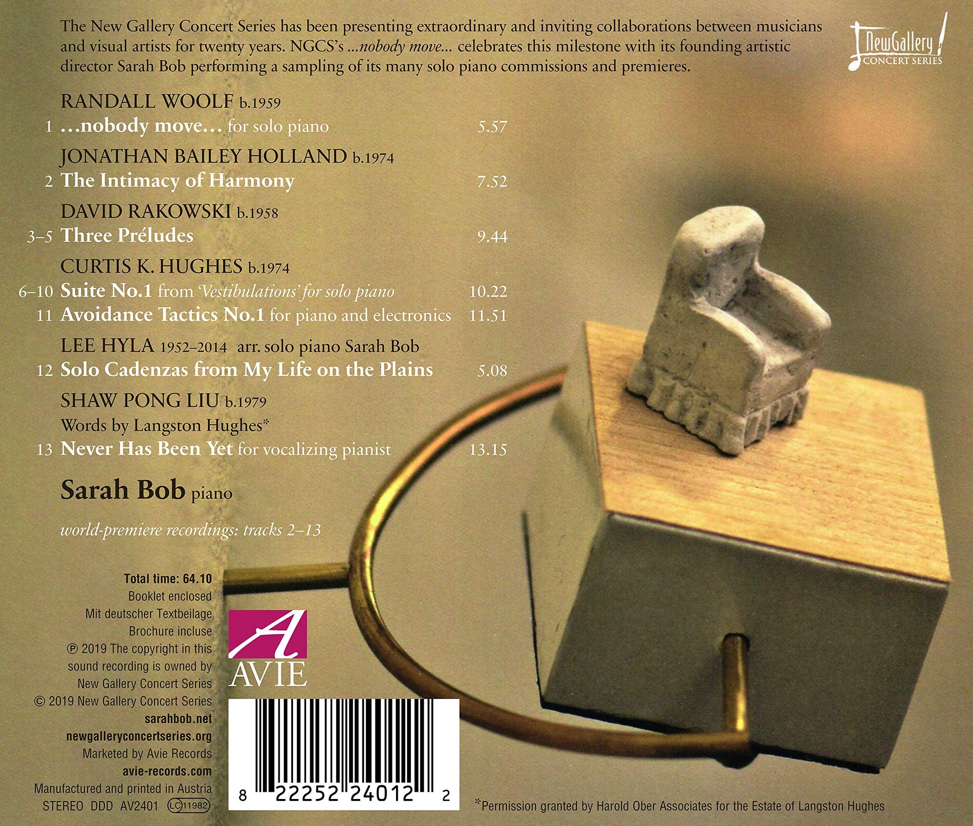 Pianist Sarah Bob is a passionate and trailblazing advocate of the music of our time who has introduced the music of dozens of living composers to the world. ‘…nobody move…’ is a collection of works by six award-winning composers whom Sarah commissioned for the Boston-based New Gallery Concert Series which she founded 20 years ago. Her exuberance and exactitude are common threads tying together the album’s diverse musical dialects, from Jonathan Bailey Holland’s evocative chord clusters in The Intimacy of Harmony to Curtis K. Hughes’ electro-acoustic Avoidance Tactics #1 and his varied suite of miniatures, vestibulations; from the late Lee Hyla’s energetic Solo Cadenzas from his large-scale orchestral work My Life on the Plains, lovingly arranged by Sarah Bob, to David Rakowski’s cheeky ‘Mind the Gap #18,’ tender ‘Wayo’ and edgy ‘Ghepardo;’ from Shaw Pong Liu’s powerful ‘Never Has Been Yet,’ which sets Langston Hughes’ poem ‘Let America Be America Again;’ to Randall Woolf’s fearlessly virtuosic title track. ‘…nobody move…’ is a striking album that ranges from in your face to contemplative moods, entertaining the ears of contemporary music lovers and novices alike.