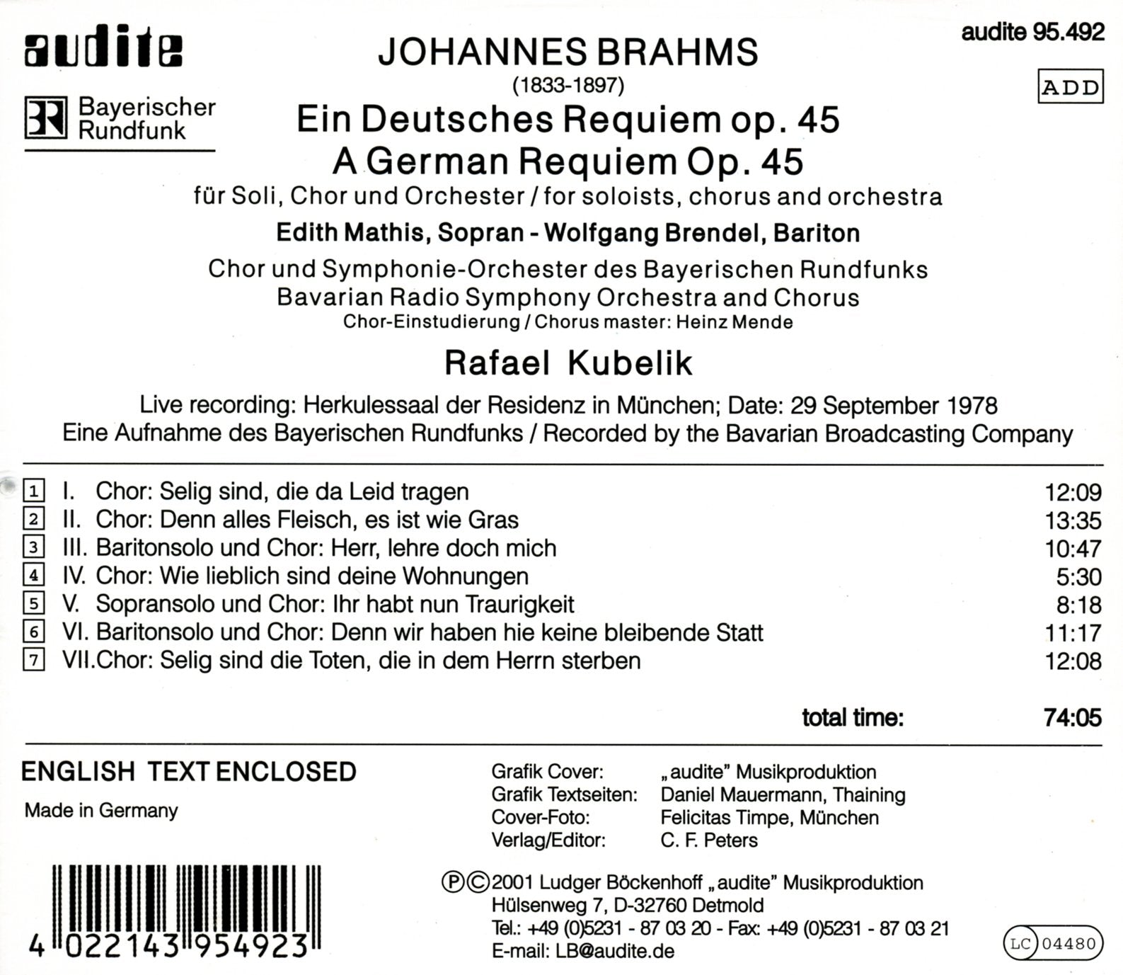 Audite's series of Rafael Kubelik's live broadcasts from his tenure in Munich goes from strength to strength. Latest is this superb 1978 Brahms Requiem, bathed in glorious sound that lets you hear details in the chorus and orchestra often missed in other versions. Part of that, of course, is due to Kubelik's conducting. He always stressed proper balances, taking care to bring out details but never exaggerate them. Kubelik recordings usually also feature sane, middle-of-the road to slightly fast tempos, a wide dynamic range, and string sound that glows with warmth. They're all present here. In the Requiem, he's some five minutes slower than his atypically fastest competitor, Klemperer (EMI), and at 74 minutes somewhat slower than most of the other performances I checked. But the impression the recording makes is of spaciousness and expressive power; Kubelik never rushes or dawdles.