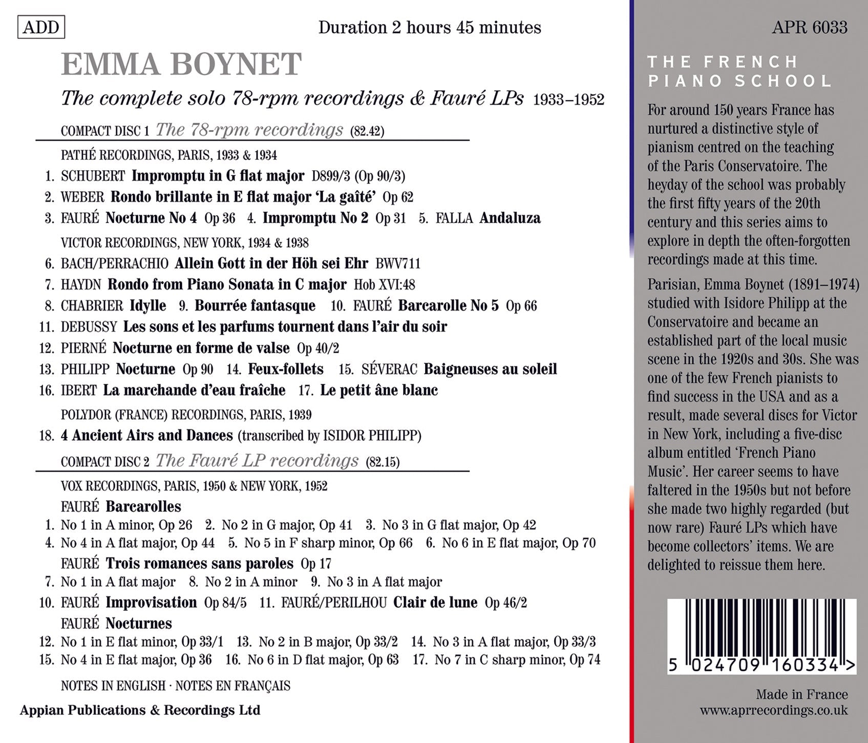 APR’s The French Piano School series is going from strength to strength, unearthing rare recordings of pianists, many who seem to have migrated off the radar. One such is Emma Boynet (1891-1974). You’ll never be let down by APR’s documentation. The Fauré recordings are the plums of the set and, for me, stand shoulder to shoulder with those of that other grande dame of the keyboard Germaine Thyssens-Valentin. - MusicWeb
