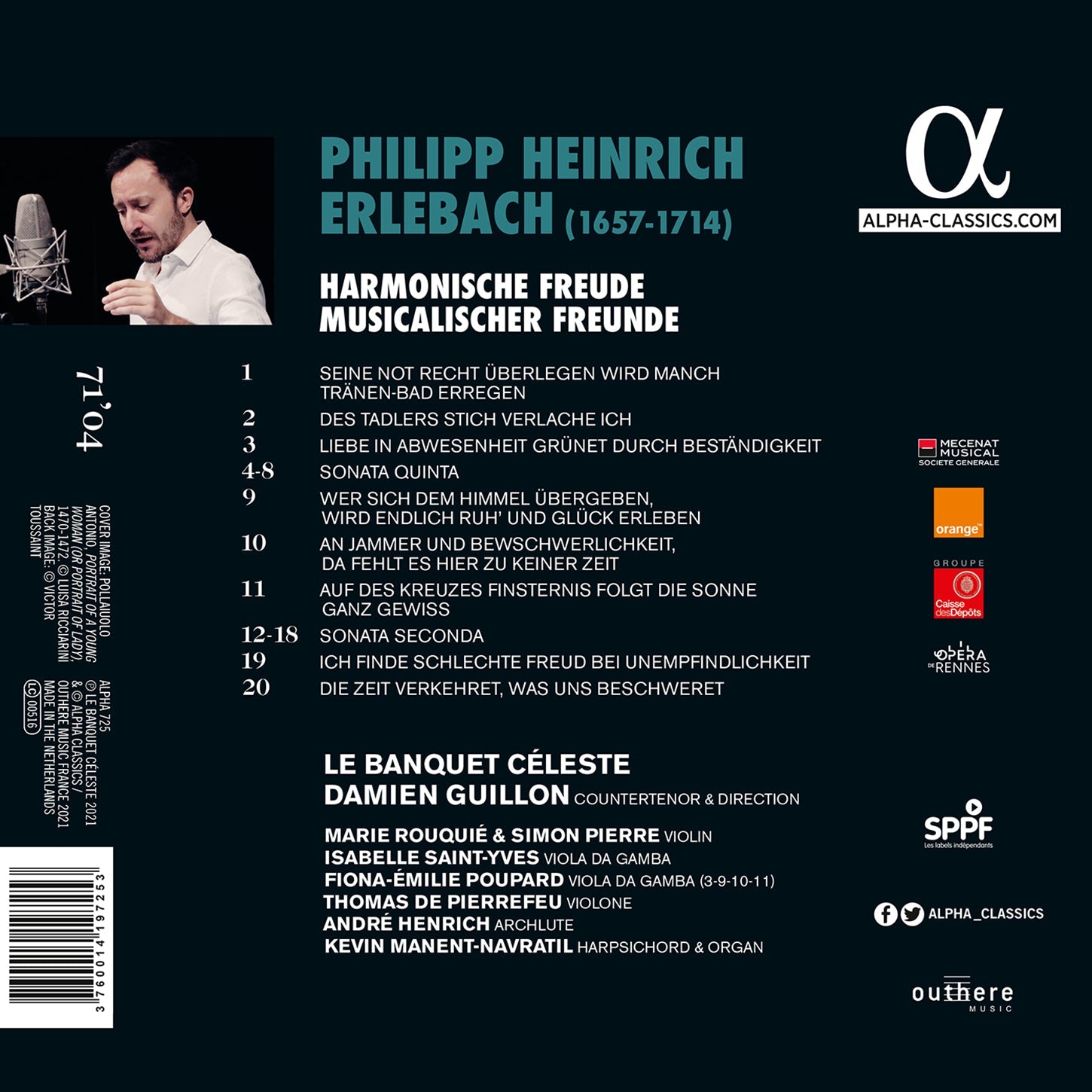 Accompanied by his ensemble Le Banquet Céleste, the countertenor Damien Guillon places his voice at the service of a program of vocal pieces by the German Baroque composer Philipp Heinrich Erlebach, a large part of whose output was destroyed in a fire at Rudolstadt Castle in 1735. Among the works that have come down to us are the two collections Harmonische Freude musikalischer Freunde, containing respectively fifty and twenty-five arias for one to four solo voices, instrumental ensemble and basso continuo.