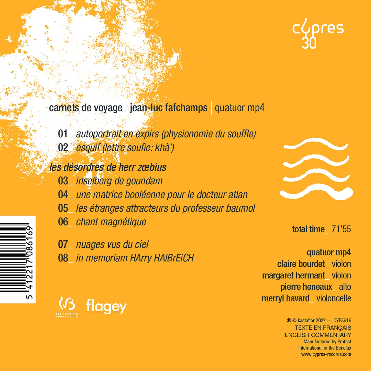 These "Carnets de voyage", which include all of Jean-Luc Fafchamps' pieces for string and keyboard quartet, are intimately linked to the MP4 Quartet. For several years, the four musicians have been taking them everywhere they perform, even to India, where these works are considered to be world music! From "Autoportrait en expirs", which depicts a whole life through the breath (to the last one), to the contemplations of "Nuages vus du ciel", via the electronic delirium of the "Lettre Soufie", Jean-Luc Fafchamps tells us the story of his solitary expeditions to the farthest reaches of the earth. Fasten your seatbelts and turn off the lights, because you can only see well with your eyes closed.