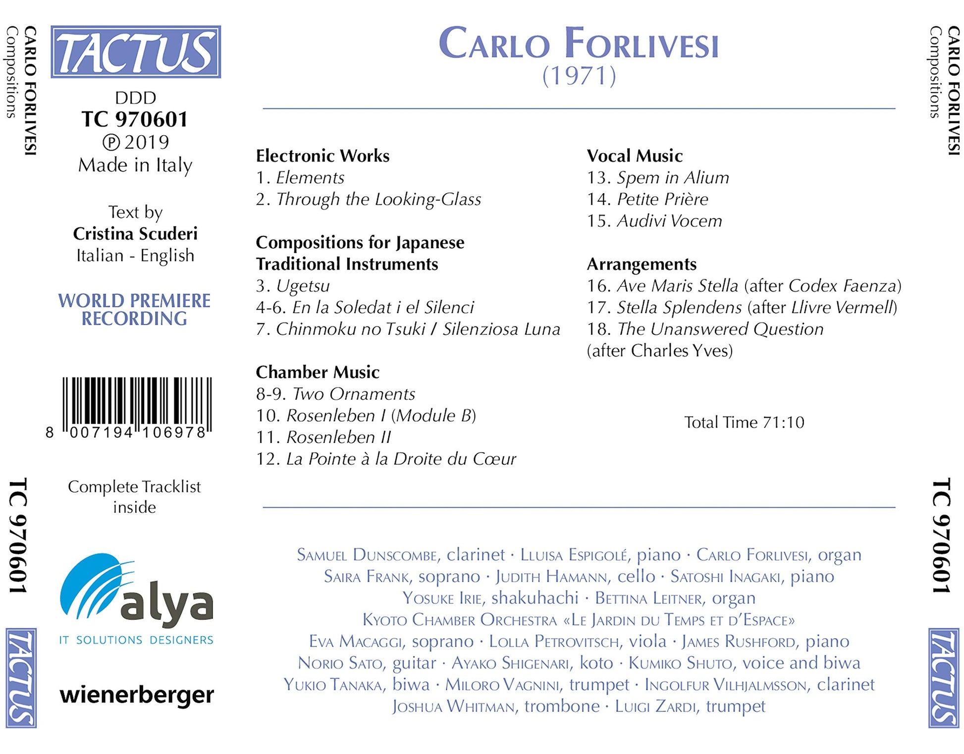 The internationally acclaimed young composer Carlo Forlivesi moves in a geographical and temporal space led by electronic, orchestral, chamber music and ethnic instruments, digging the past of the ancient Latin hymns, Bach and Haydn, and exploring a traditional culture completely different and far from ours. Forlivesi was born in Faenza, Emilia-Romagna. He studied at Bologna Conservatory, Milan Conservatory and the Accademia Nazionale di Santa Cecilia of Rome. He then joined IRCAM (Institute de Recherche et Coordination Acoustique/Musique) and subsequently DIEM (Danish Institute of Electroacoustic Music), Tokyo College of Music, and Northwestern University, with fellowships from the governments of Italy, Denmark, Japan, and the United States (Fulbright Commission). His activity has mainly focused on new music in Europe, the United States, and Japan. Forlivesi has conducted extensive research in the field of traditional Japanese music and dance including the ethnic music of the Ainu. Beside contemporary music, he cultivates a particular interest in early music, which he studied and performed for several years.