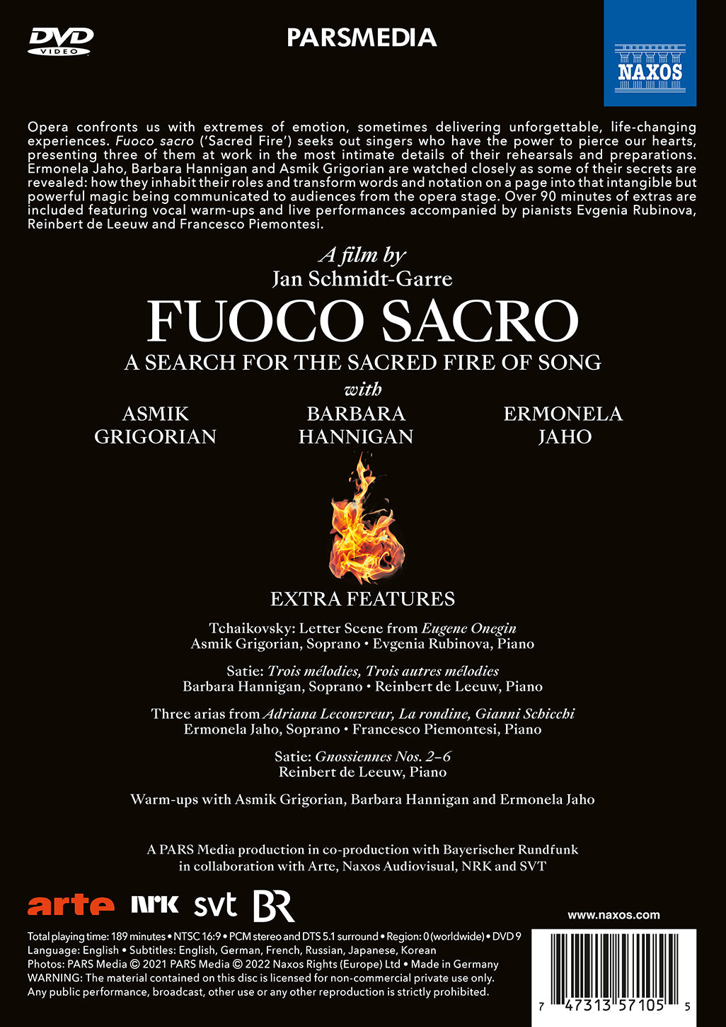 Opera confronts us with extremes of emotion, sometimes delivering unforgettable, life-changing experiences. Fuoco Sacro (‘Sacred Fire’) seeks out singers who have the power to pierce our hearts, presenting three of them at work in the most intimate details of their rehearsals and preparations. Ermonela Jaho, Barbara Hannigan and Asmik Grigorian are watched closely as some of their secrets are revealed: how they inhabit their roles and transform words and notation on a page into that intangible but powerful magic being communicated to audiences from the opera stage. Over 90 minutes of extras are included featuring vocal warm-ups and live performances accompanied by pianists Evgenia Rubinova, Reinbert de Leeuw and Francesco Piemontesi.
