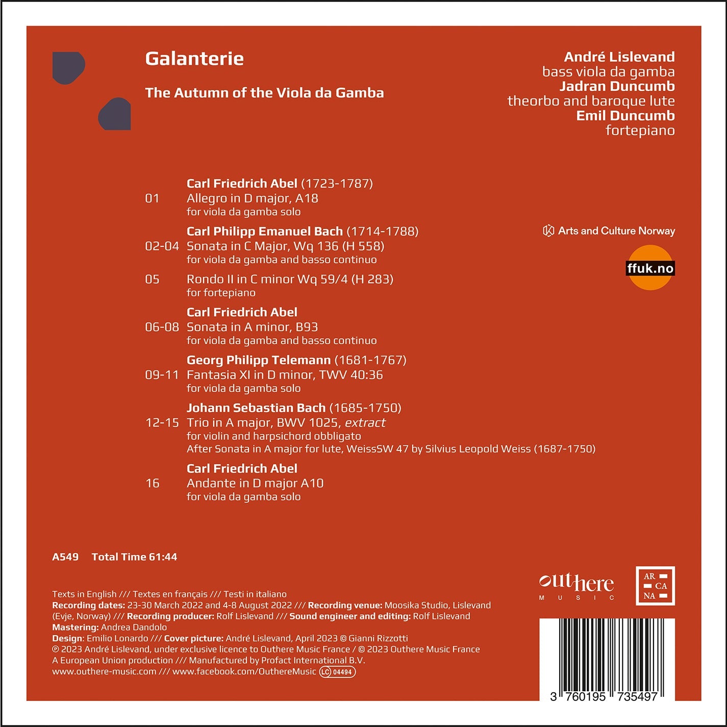 Awarded a Diapason Découverte, André Lislevand’s debut album Forqueray Unchained (Arcana A486, 2021) celebrated one of moments of greatest splendor for the viola da gamba: that of the ancien régime in France. In this repertoire, the young musician proved to be "absolutely on top of his game and not afraid to explore the extremes of his instrument’s aesthetic world, though without ever losing touch with le bon goût" (Early Music Review). The same youthful freshness and energy can be found in his second album, though here he explores the German repertoire of the central decades of the 18th century, a period that witnessed the gradual decline of the instrument, but was still capable of expressing unexpected treasures and developing an idiom that often seems to anticipate the years to come. In the program are sonatas for gamba and basso continuo (C.P.E. Bach’s WQ 136 and C.F. Abel’s B93 in A minor), Telemann's Fantasia XI for solo viol, two pieces by Abel from the Drexel Manuscript, and finally, the lesser-known Suite BWV 1025 by J.S. Bach, presented here in a version for viola da gamba and concertante lute. Also featured and playing a vital role in this project are the Duncumb brothers, two extraordinary chamber musicians: Emil on the fortepiano and Jadran, who already played on the debut album, on the lute.