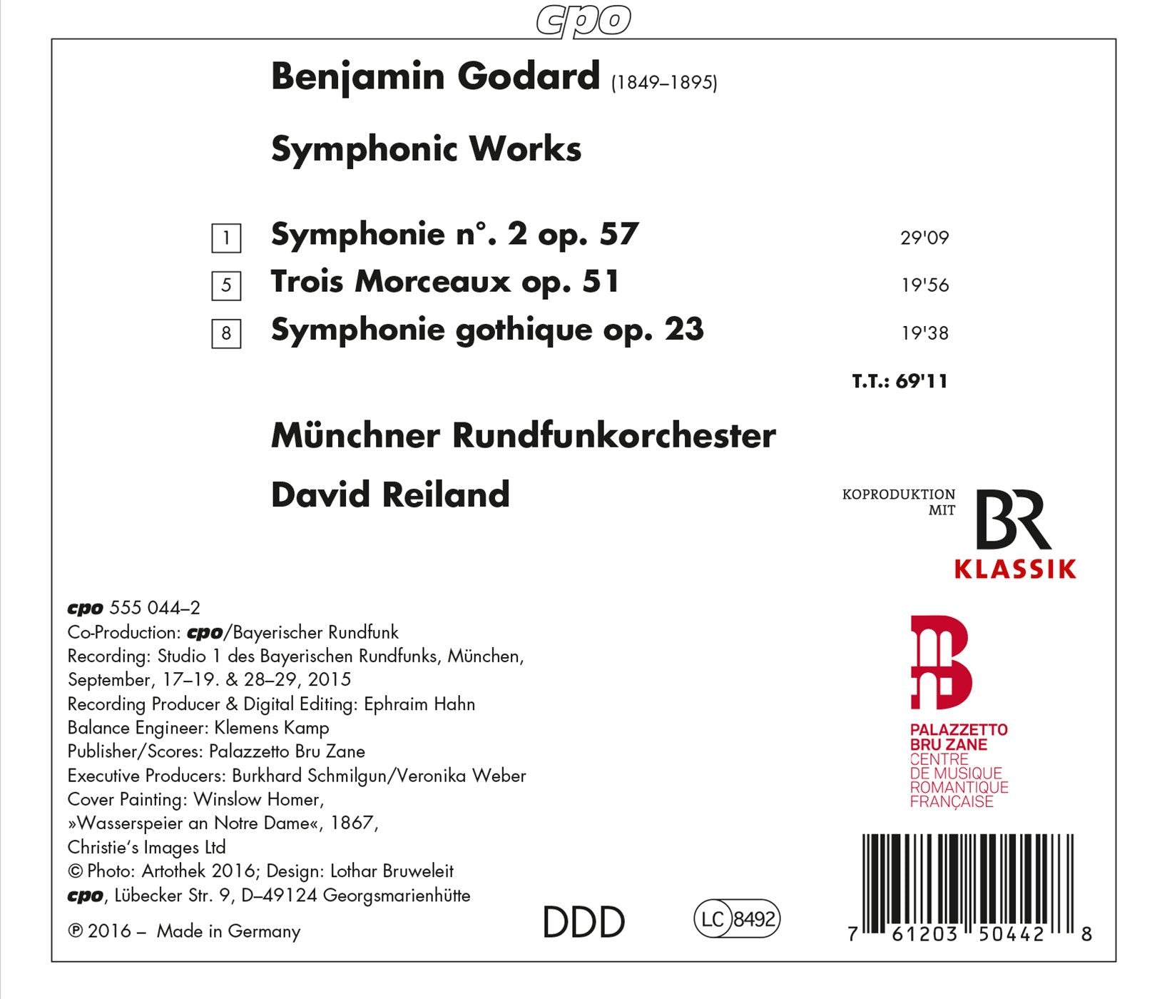 A composition student of Napoleon-Henri Reber and a violin student of Henri Vieuxtemps, Benjamin Godard received a thorough education before beginning his teaching career at the Paris Conservatory in 1887. Although much of Godard’s works are forgotten, possibly due to his untimely death, his symphonic works featured here show an original outlook on the genre, fusing together melodic qualities with technical brilliance. This release features his Symphony No. 2, Op. 57, his Trois Morceaux, Op. 51, and his Symphonie gothique, Op. 23 performed by the Munchner Rundfunkorchester, conducted by David Reiland.